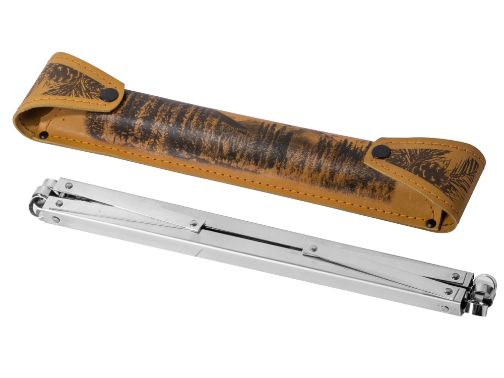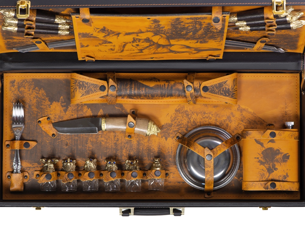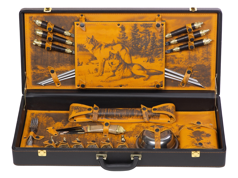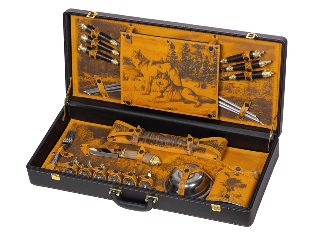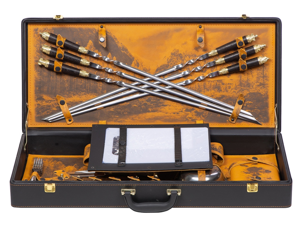Комплектность: шампура большие- 6 шт, доска разделочная, вилка- 6 шт, нож, стопка- 6 шт, тарелка- 6 шт, фляга, шампура маленькие- 6 шт, мангал