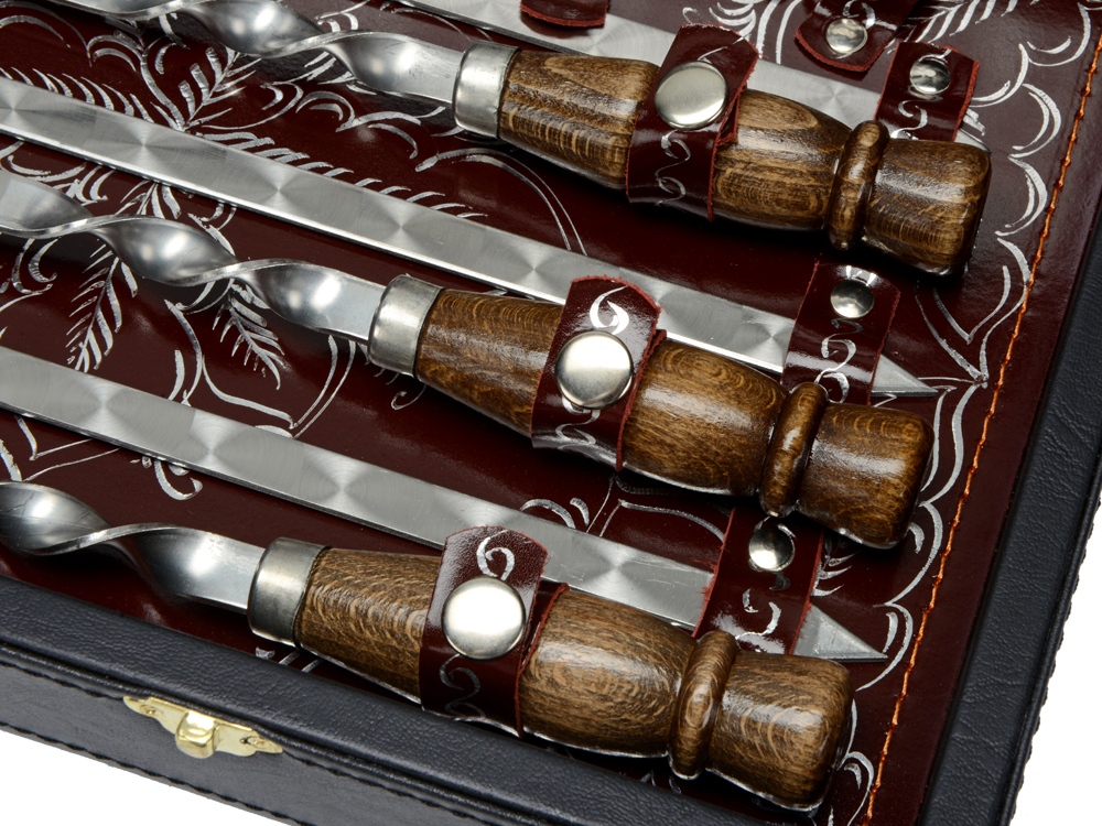 Солидный чемоданчик с набором шампуров и мангал не оставят равнодушными ни одного любителя шашлыка. Немаловажно, что ручка у шампуров деревянная - кроме красоты, это еще и удобно - дерево приятнее брать, оно не нагревается (если, конечно, не совать его в огонь). Кроме того, в подарке имеются нож сомелье, с помощью которого вы сможете с легкостью открыть бутылку.