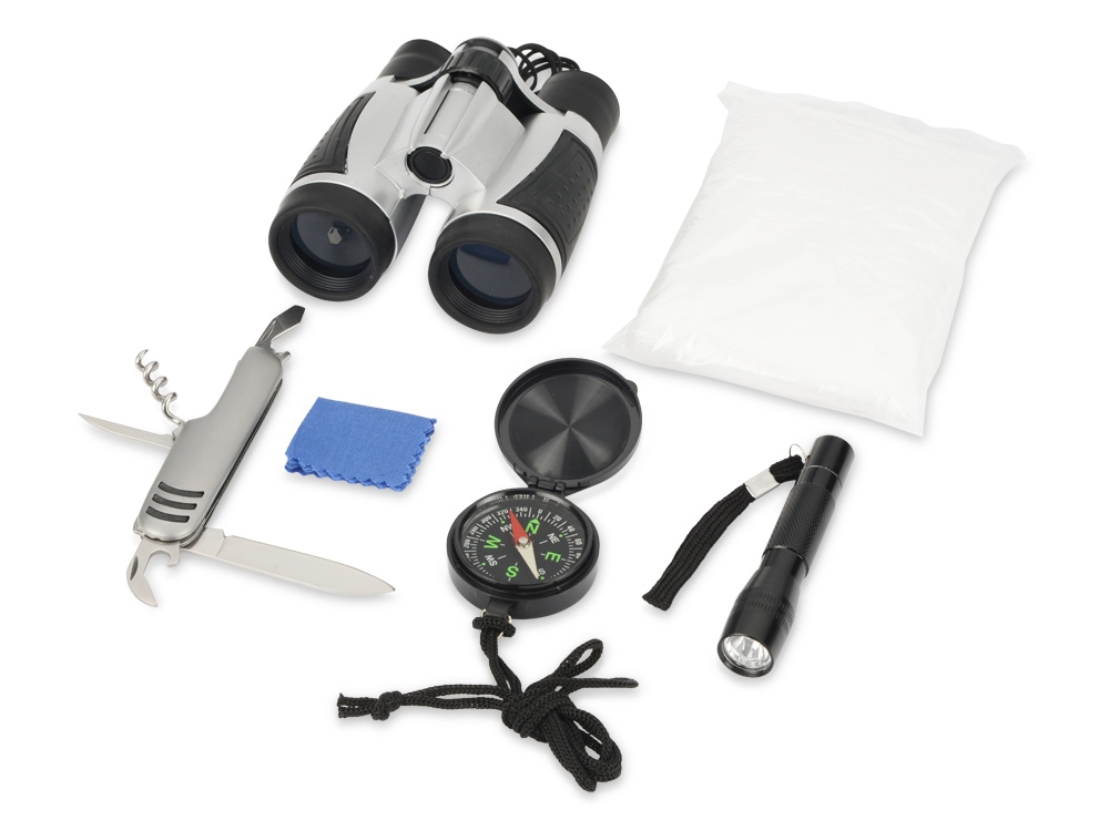 Комплектность: бинокль 4*30, мультиинструмент, фонарь, компас, дождевик, салфетка