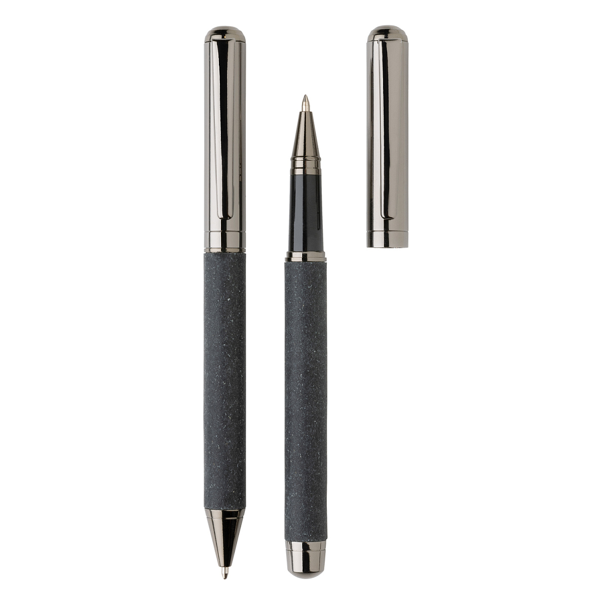 Набор из шариковой ручки и роллера декорирован элементами из переработанной кожи и поставляется в чехле в тон. Синих чернил Dokumental хватит надолго! Длина письма шариковой ручки — 1200 м, роллера — 400 м. Набор поставляется в подарочной коробке с принтом под переработанную кожу. , высота 13,4 см., диаметр 10,5 см.