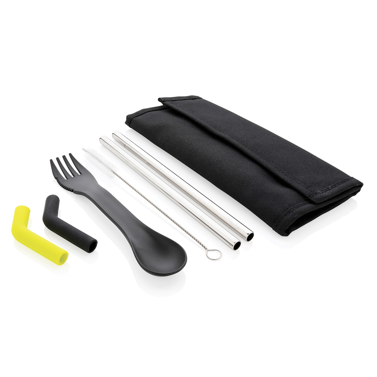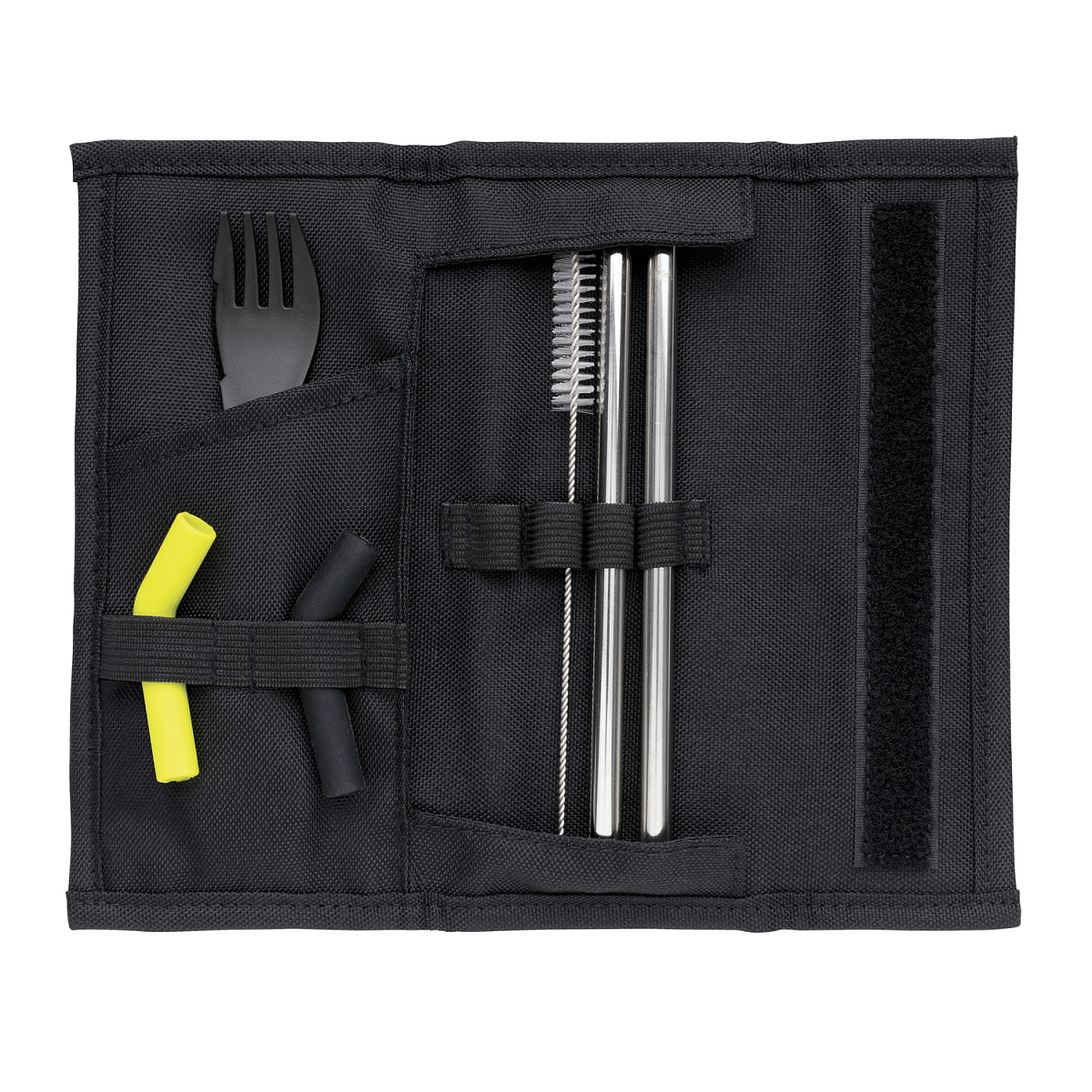 Набор столовых приборов Tierra — идеальный спутник для тех, кто хочет сократить использование одноразового пластика. В него входят 2 соломинки из нержавеющей стали, ершик для мытья, ложка-вилка и 2 силиконовые насадки на трубочки для более комфортного питья. Благодаря разным цветам насадок вы легко отличите их друг от друга. Приборы поставляются в удобном чехле для хранения, который надежно закрывается на липучку. Совместим с посудомоечной машиной. Чехол снаружи — полиэстер 600D, внутри — 100% полиэстер 210D. Не содержит ПВХ. Длина 22,5 см., ширина 19 см., высота 0,3 см., диаметр 0 см.