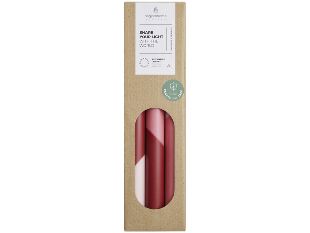 Свечи для ужина Eden отличаются яркой диагональной цветовой палитрой и изготовлены вручную из воска на растительной основе, не содержащего парафина. Они не имеют запаха, имеют фитиль из 100% хлопка и горят чисто. Каждая покупка способствует посадке дерева для фермеров в Африке и поддерживает специальный проект справедливой торговли на острове Ява, Индонезия. Комплект из трех штук. Время горения свечи: 18 – 20 часов. Воск из пальмовых ядер.