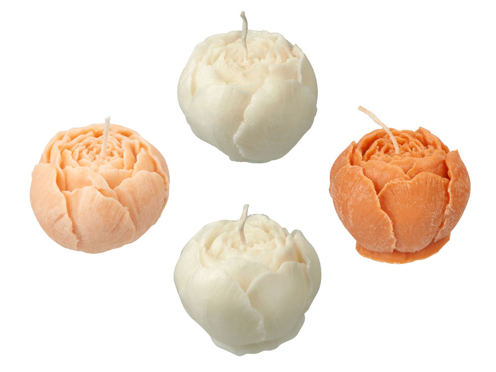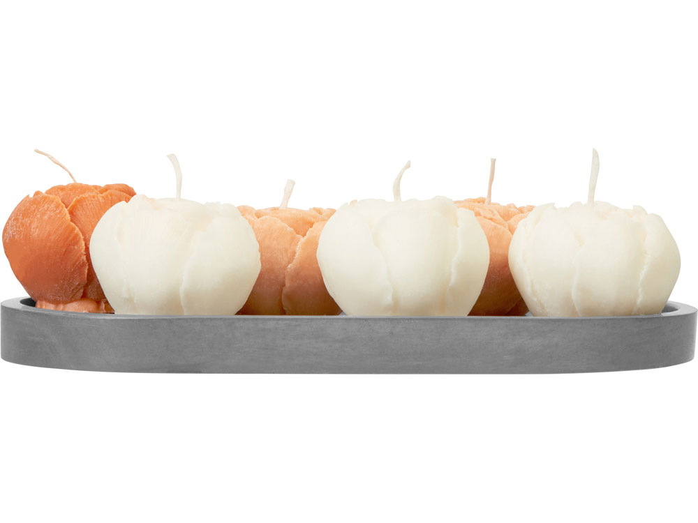 Комплектность: три белых свечи пион, одна темно-персиковая свеча пион, две персиковые свечи пион, подставка гипсобетон, упаковочный материал