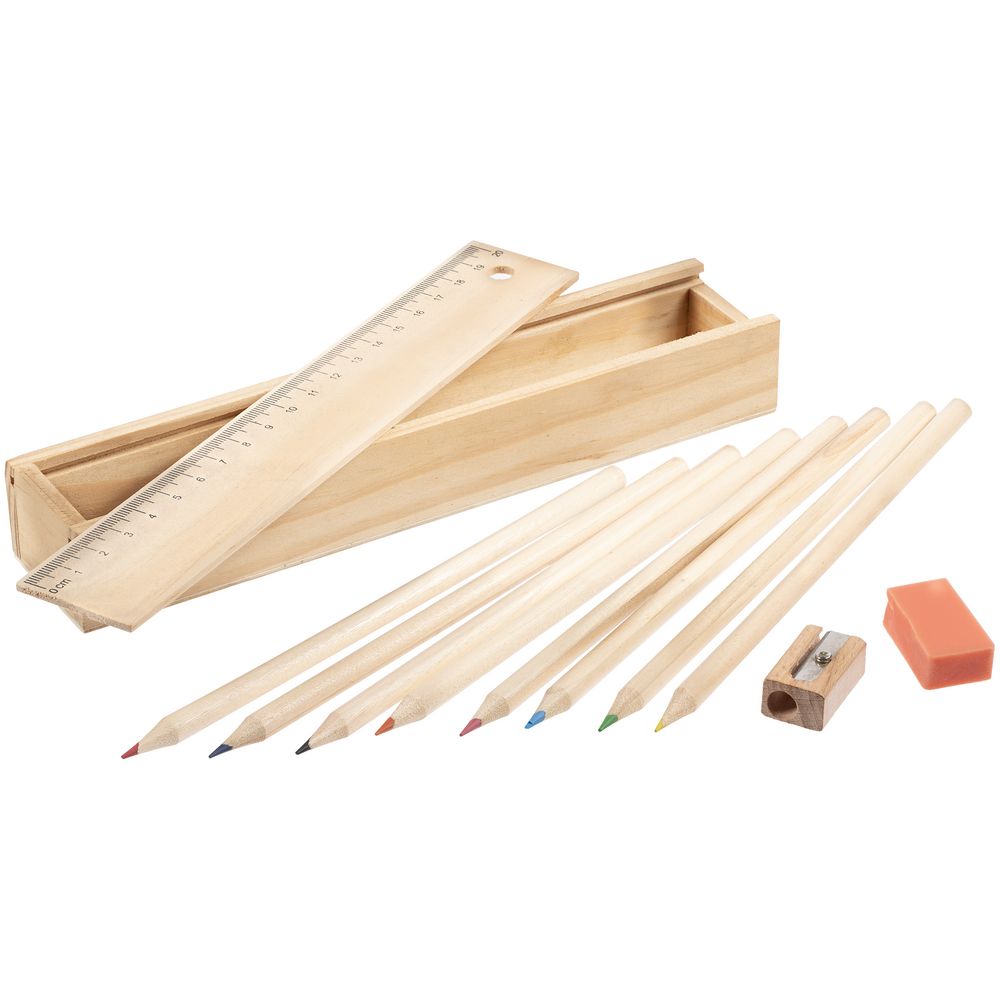 Набор из восьми цветных карандашей, точилки и ластика в деревянном пенале с крышкой-линейкой.