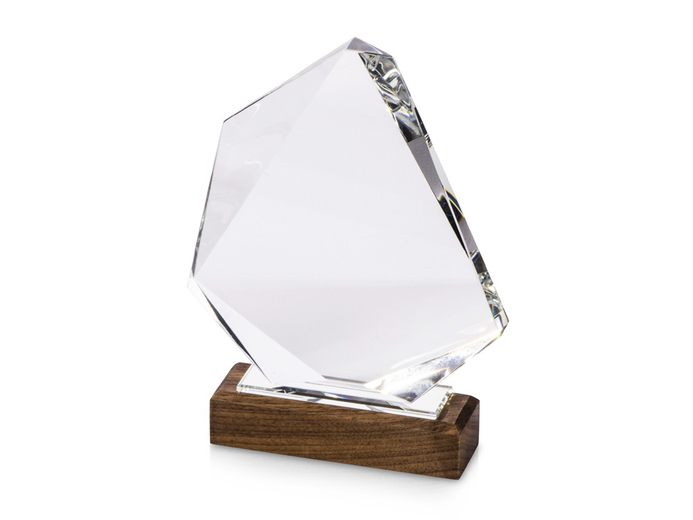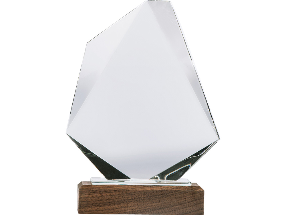 Награда выполнена из прозрачного стекла, имеет интересную асимметричную форму и расположена на деревянном постаменте.