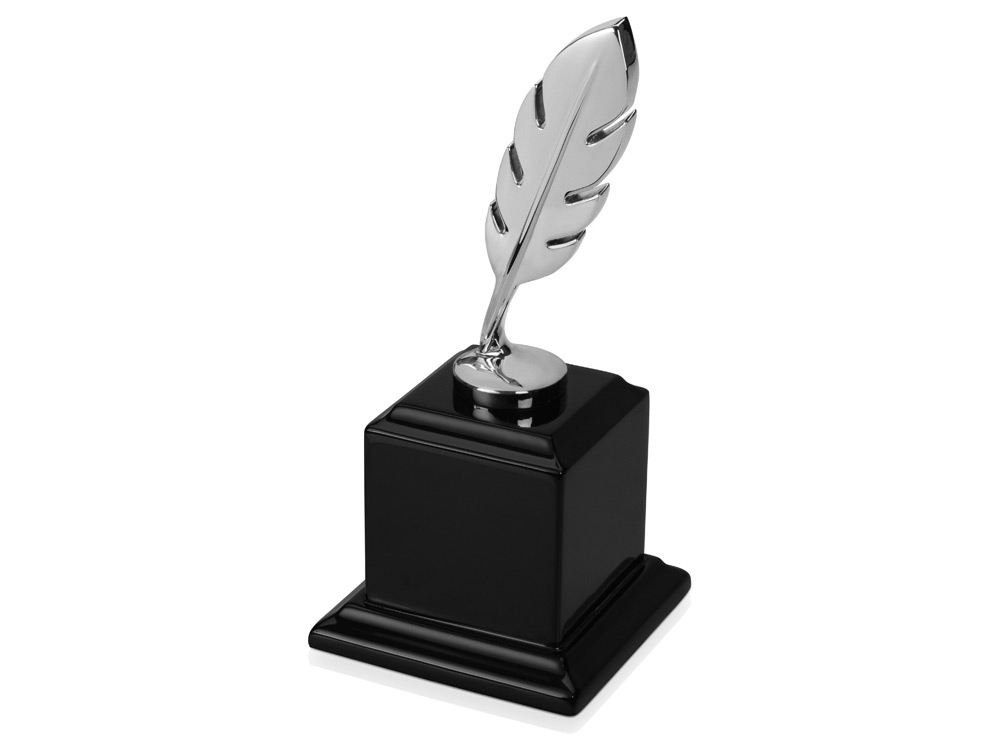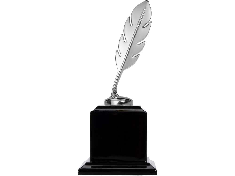 Элегантное серебристое перо на постаменте черного цвета. Замечательная награда для победителей литературных конкурсов. На постамент награды можно нанести любую надпись или прикрепить шильд.