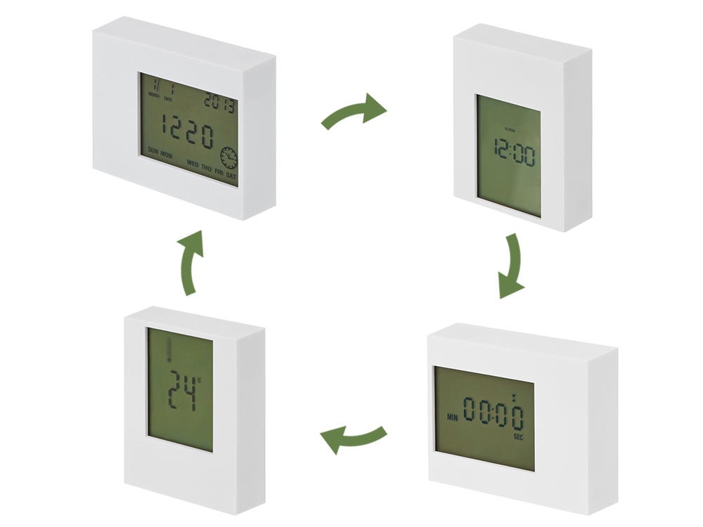 Многофункциональные настольные часы с подсветкой, которые в зависимости от положения показывают разные значения: дата и время, будильник, таймер и температура воздуха.