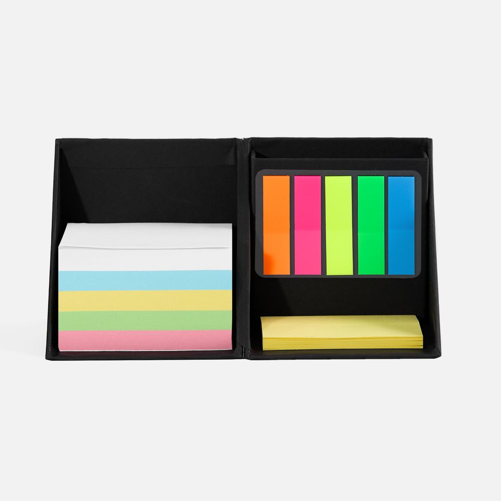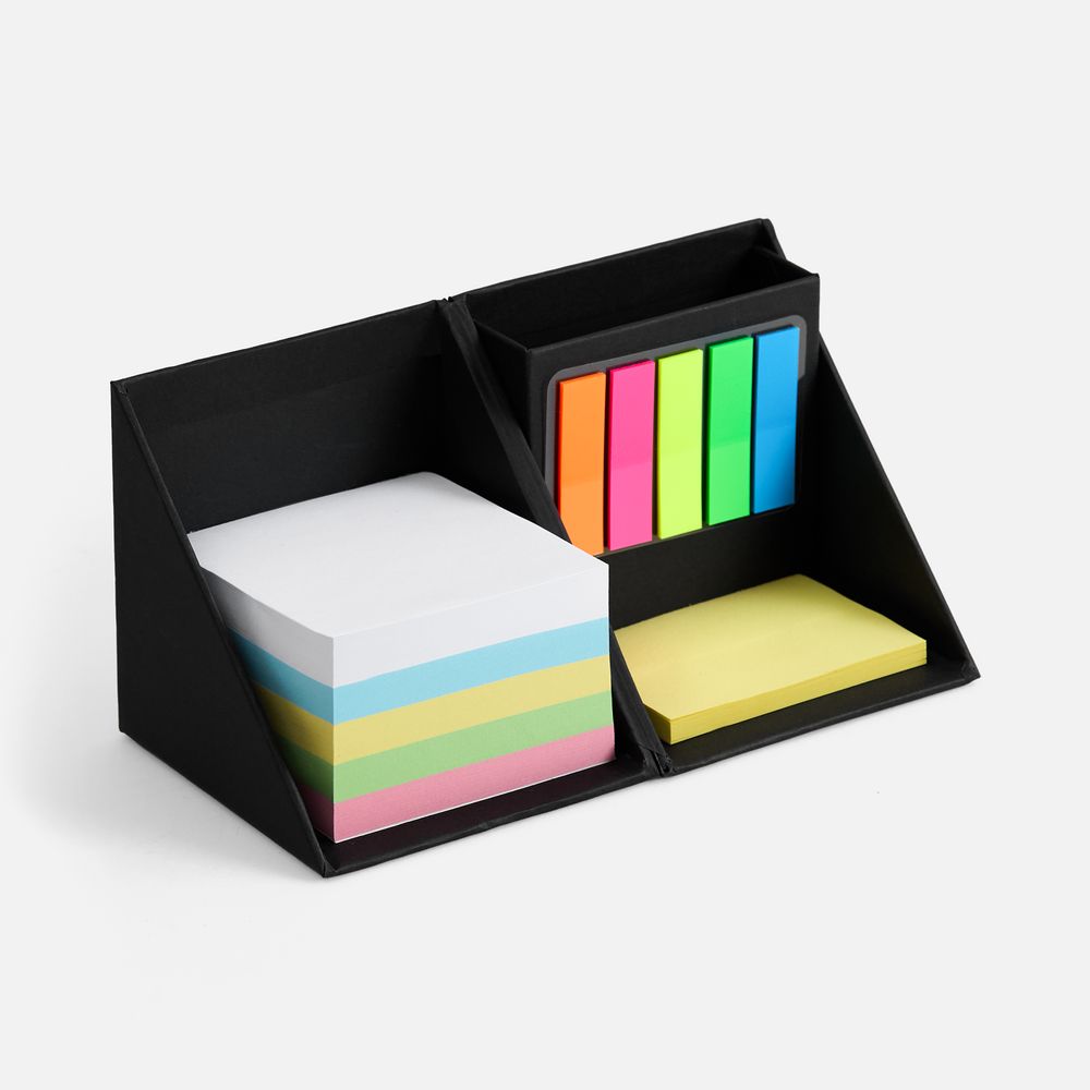 Размер: 9х9х9 см; блок бумаги 7,5х7,5 см; блок листов с клейкой лентой 7,5х5 см; пластиковые закладки 4,5х1,2 см