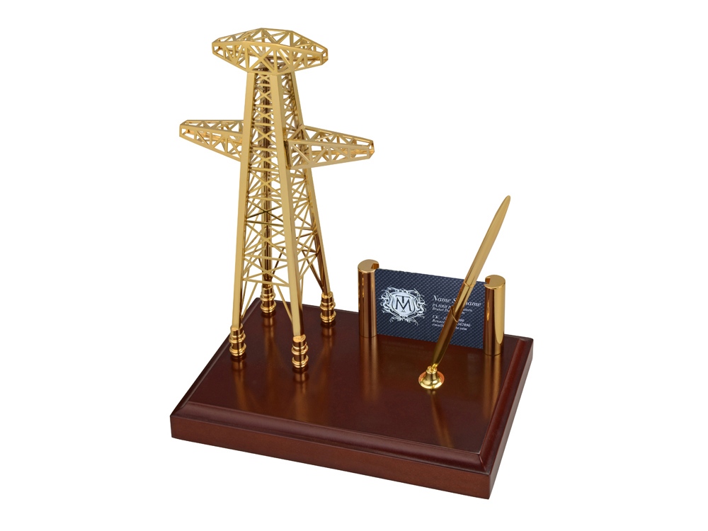 Настольный прибор со статуэткой вышки высокого напряжения станет необычным и полезным подарком представителям энергетических организаций. На приборе предусмотрены держатели для визиток и шариковой ручки.