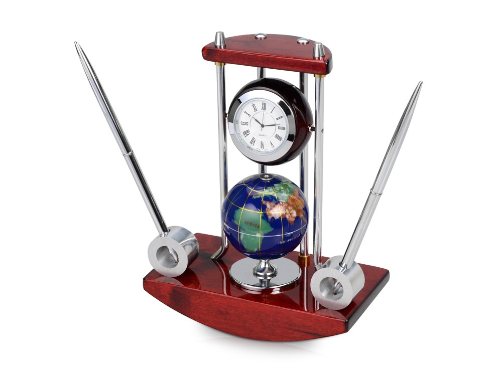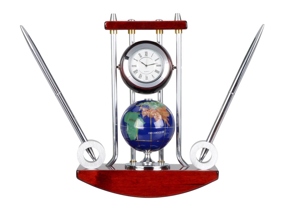 Строгие линии и формы, качественные материалы – это все говорит о продукте представительского класса. Настольный прибор состоит из точных часов, модели глобуса и двух ручек на подставке. На корпус прибора можно нанести гравировку.