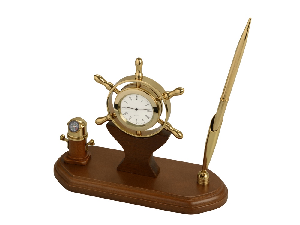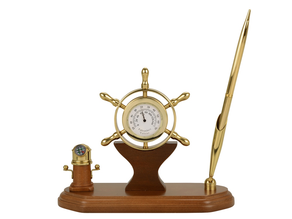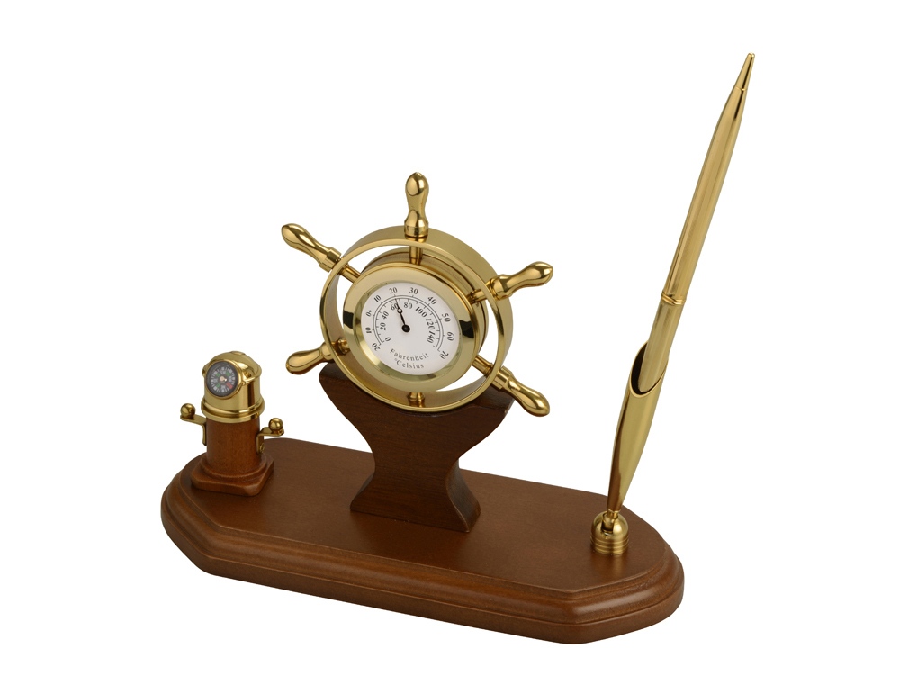 Настольный прибор У руля: часы, термометр, компас, ручка шариковая. Роскошный подарок для руководителей туристических агентств, а также капитану морского судна. Прибор позволит организовать место на рабочем столе и сделать акцент в кабинете.