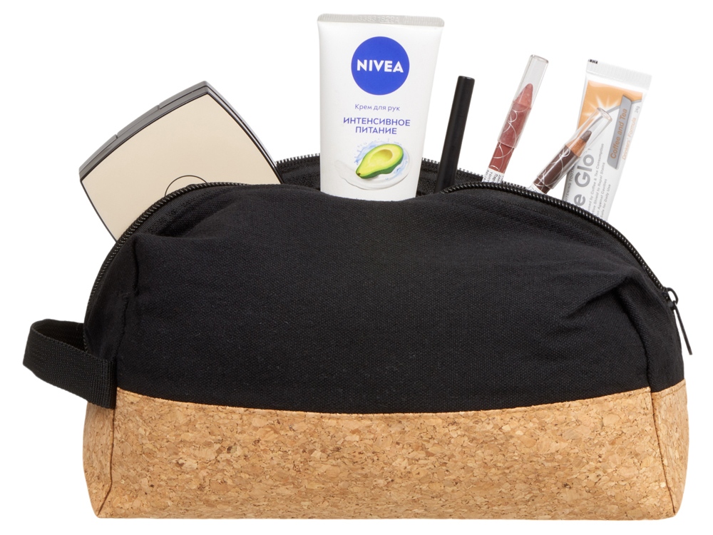 Большой вместительный несессер изготовлен из натуральных материалов- хлопка и пробки. Закрывается на молнию. Сбоку ручка для удобства использования.