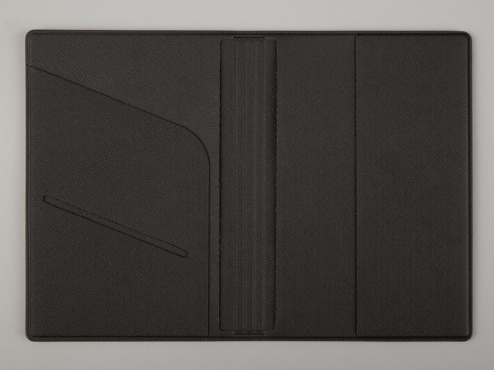 Обложка из искусственного материала, имитирующего сафьяновую кожу, с дополнительными карманами для визиток, полиса ОМС или записок.