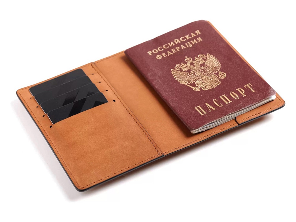Классическая обложка из дублированной кожи, прокрашенные края, аккуратный шов, прорези для четырёх карт, место для паспорта и документов на машину.