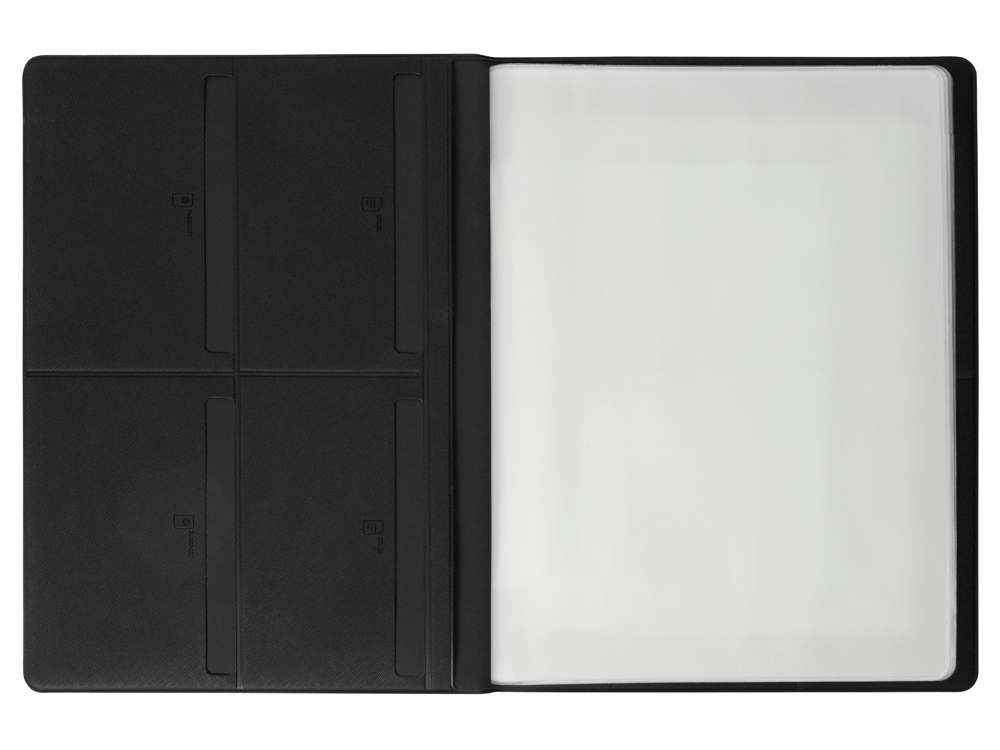 Обложка выполнена из экокожи, имеет внутренний слой из бархатистого материала и разбита на множество карманов: два больших кармана-отделения А4, 6 горизонтальных кармана с подписями и иконками, уточняющими тип документа, который можно поместить внутрь, пять карманов под визитки или кредитные карты.
