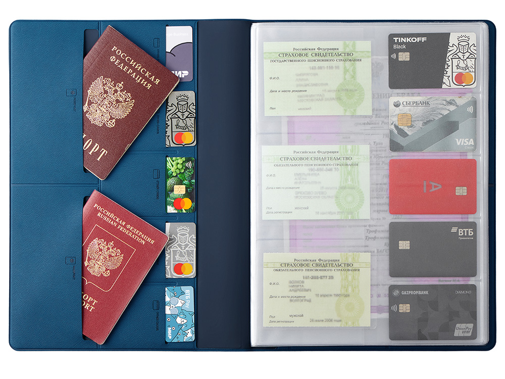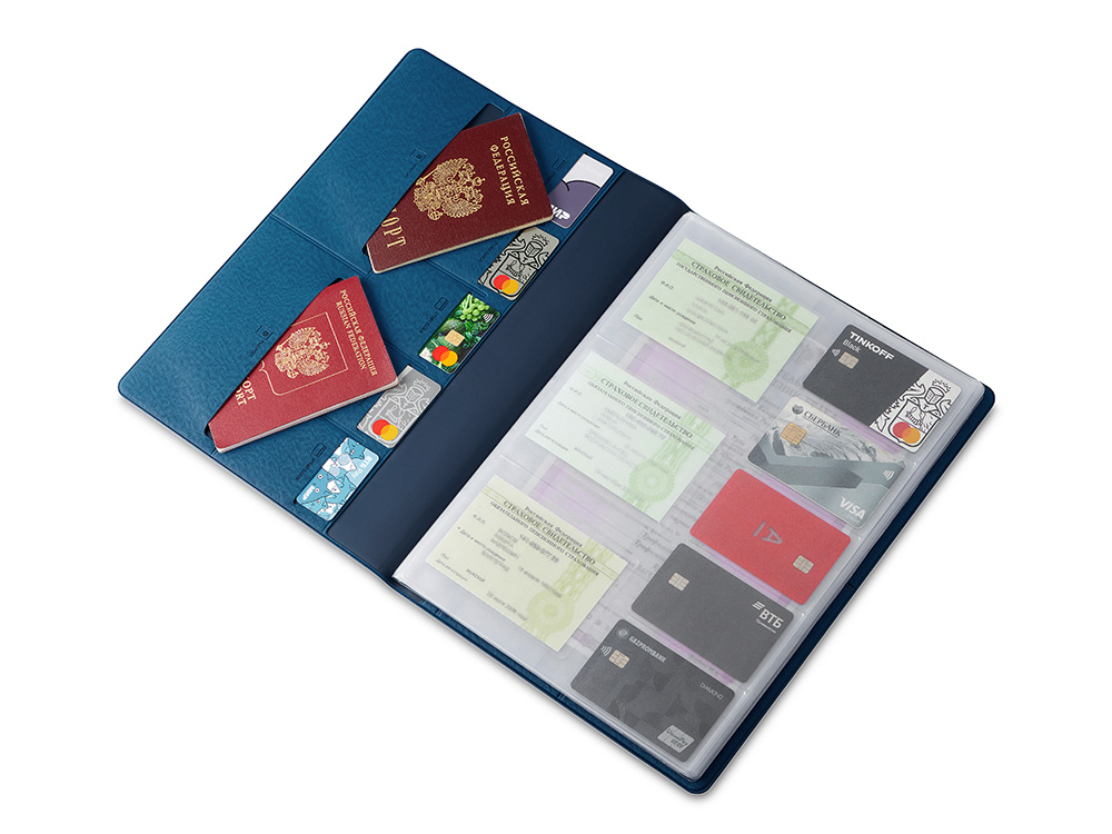- 6 горизонтальных кармана 10 х 14 см с подписями и иконками, уточняющими тип документа, который можно поместить внутрь