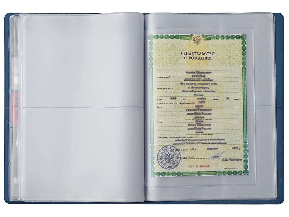 С ним свидетельства о рождении, браке и др. важные документы будут рассортированы и доступны для просмотра, будучи помещенными в прозрачные кармашки из пленки ПВХ.