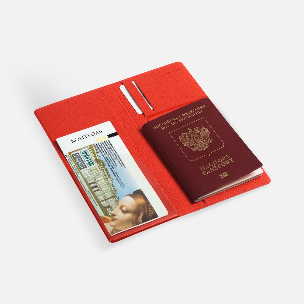 Органайзер из искусственного материала, имитирующего сафьяновую кожу, имеет 5 отделений: для билетов, паспорта, визиток или кредитных карт.