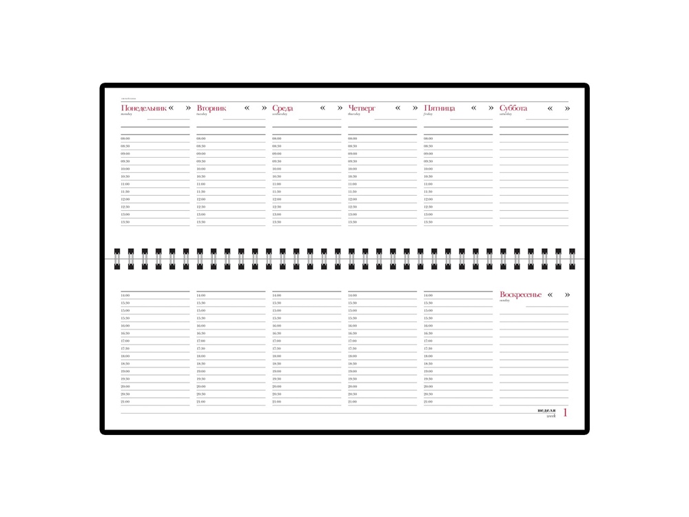 Недатированный планинг выпускается размером 305*130 мм и содержит 128 страниц (блок 292 х100 мм). Для них выбрана высококачественная белая бумага плотностью 70 грамм. Разворот представляет собой разметку на 7 дней недели с графами с указанием времени. Месяц и день недели указаны на русском и английском языках. Первые 15 страниц содержат справочные сведения из различных областей на русском языке. Крепление листов на открытом гребне способствует быстрому переходу по страницам.