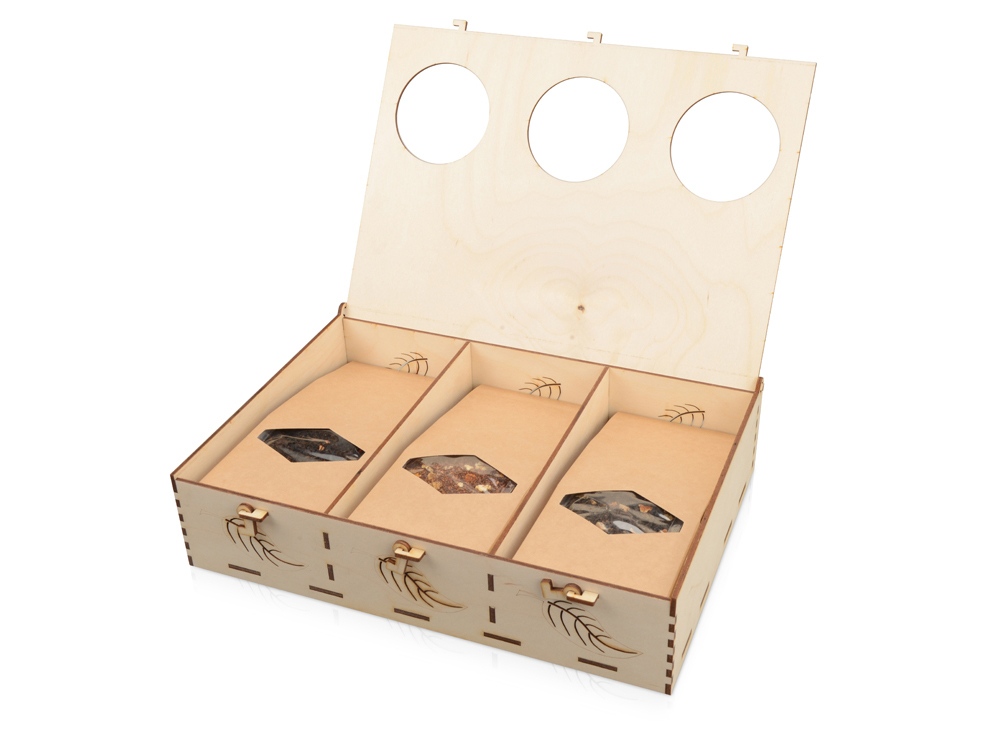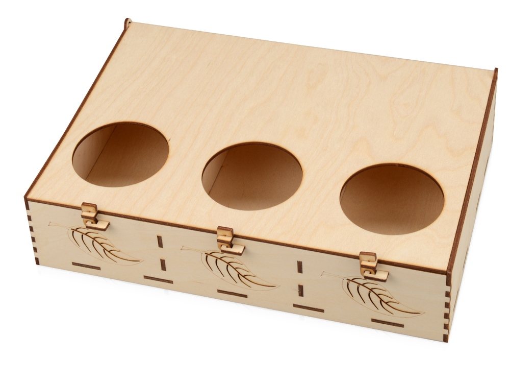 Подарочная коробка из трех секций, украшенная экопринтом в виде листа растения. В крышке над каждой из секций есть отверстие, чтобы можно было рассмотреть содержимое. Коробка выполнена из березовой фанеры и отлично гармонирует с наполнителем из крафтовой бумаги. Хотите нестандартно украсить подарок? Упакуйте его в подарочную коробку Лист, она сохранит его содержимое в целости и сохранности.