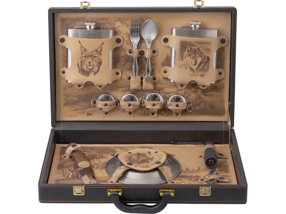 Все комплектующие упакованы в кейс из сплит-кожи с внутренней отделкой из натуральной кожи, украшенной художественным выжиганием. Обратите внимание, что художественное выжигание может отличаться от представленного на фото, так как это ручная работа, что делает каждый экземпляр по-настоящему уникальным.