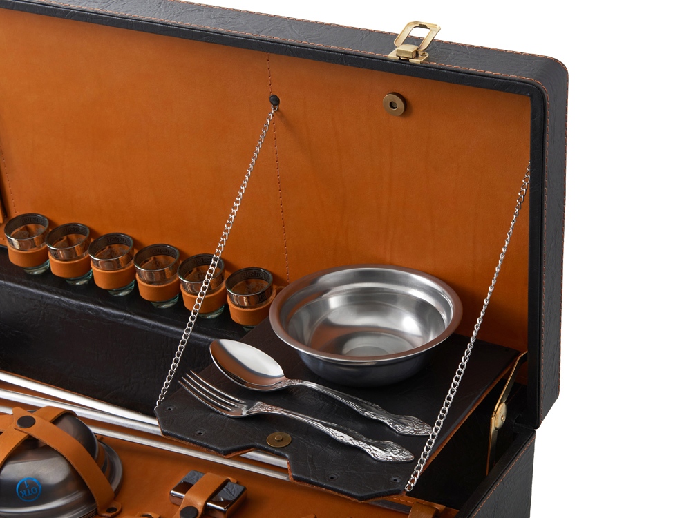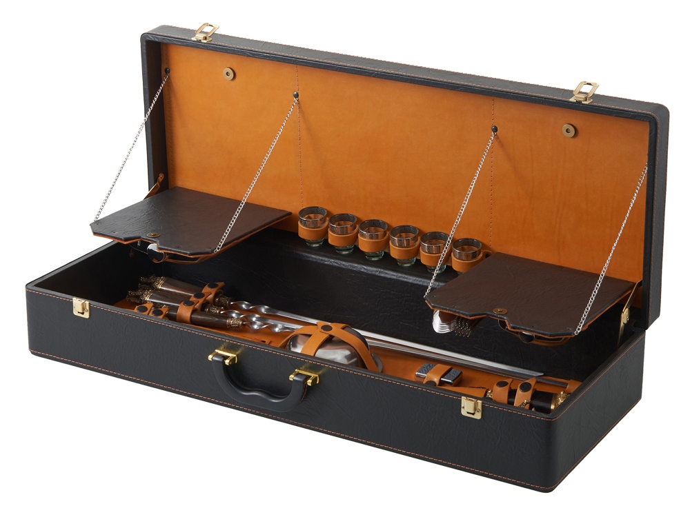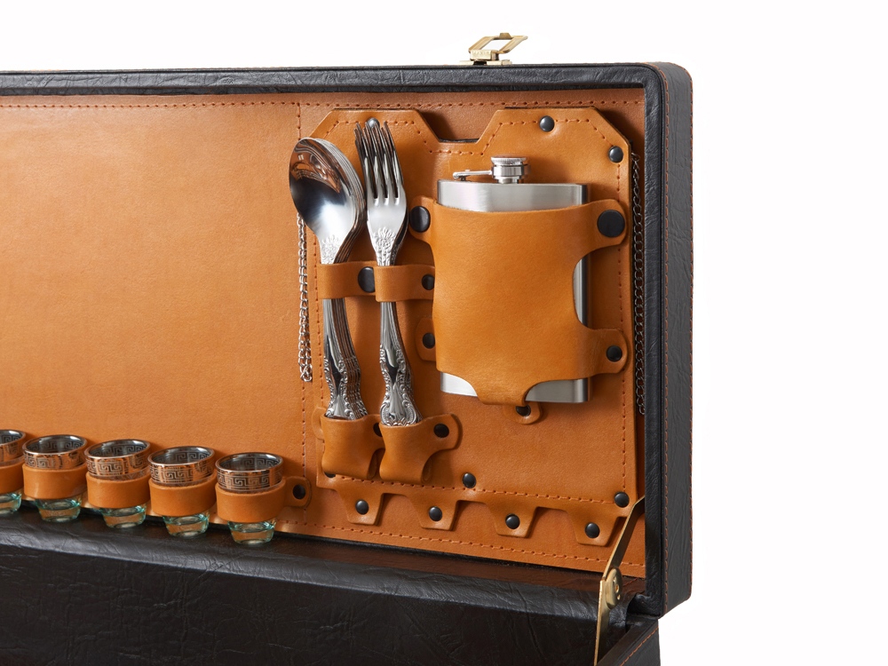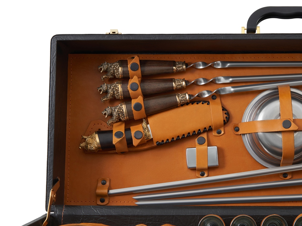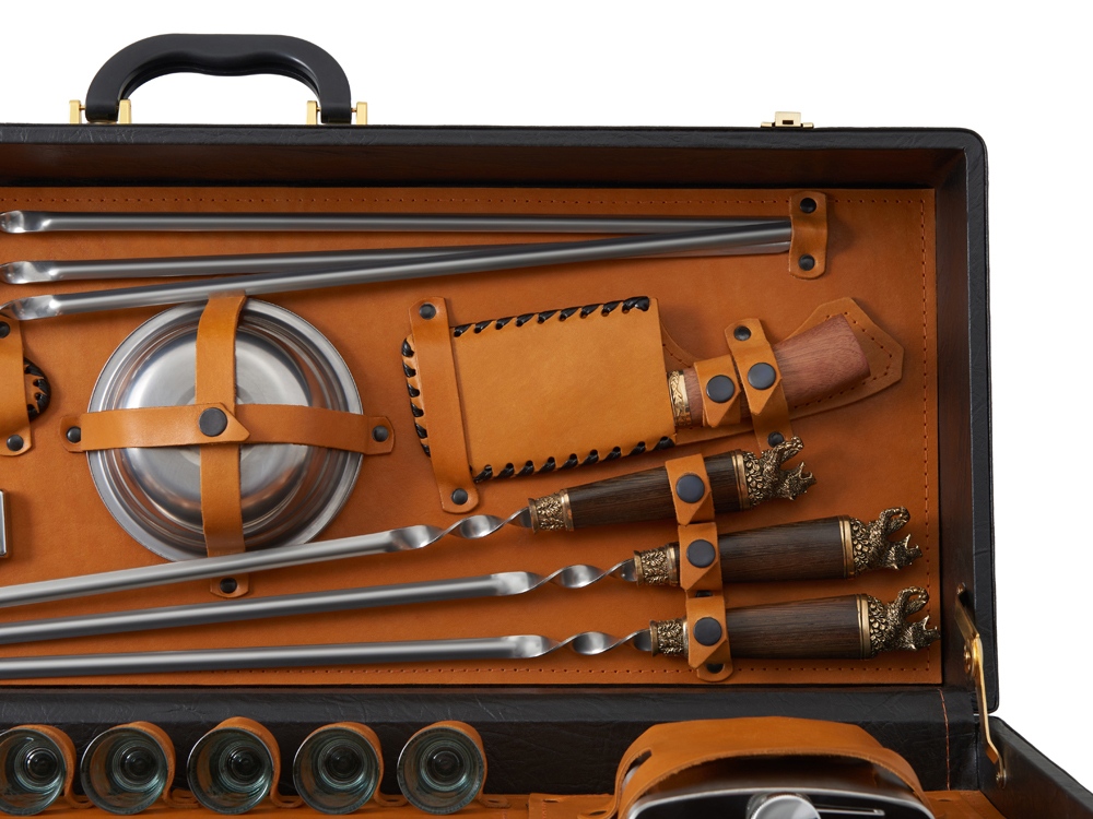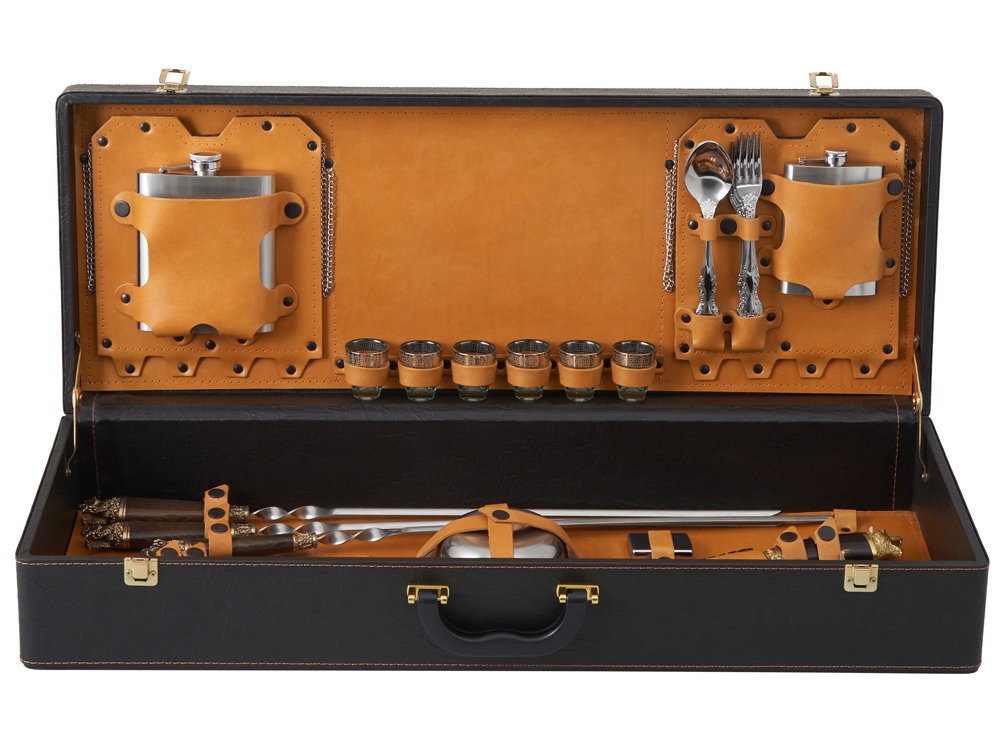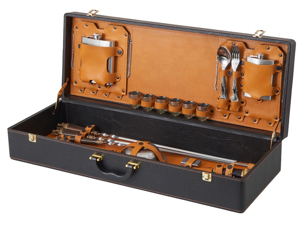 Комплектность: шампура большие- 6 шт, фляга большая, фляга малая, вилка- 6 шт, ложка- 6 шт, стопка- 6 шт, нож Тяпка, нож разделочный, зажигалка, тарелка- 6 шт