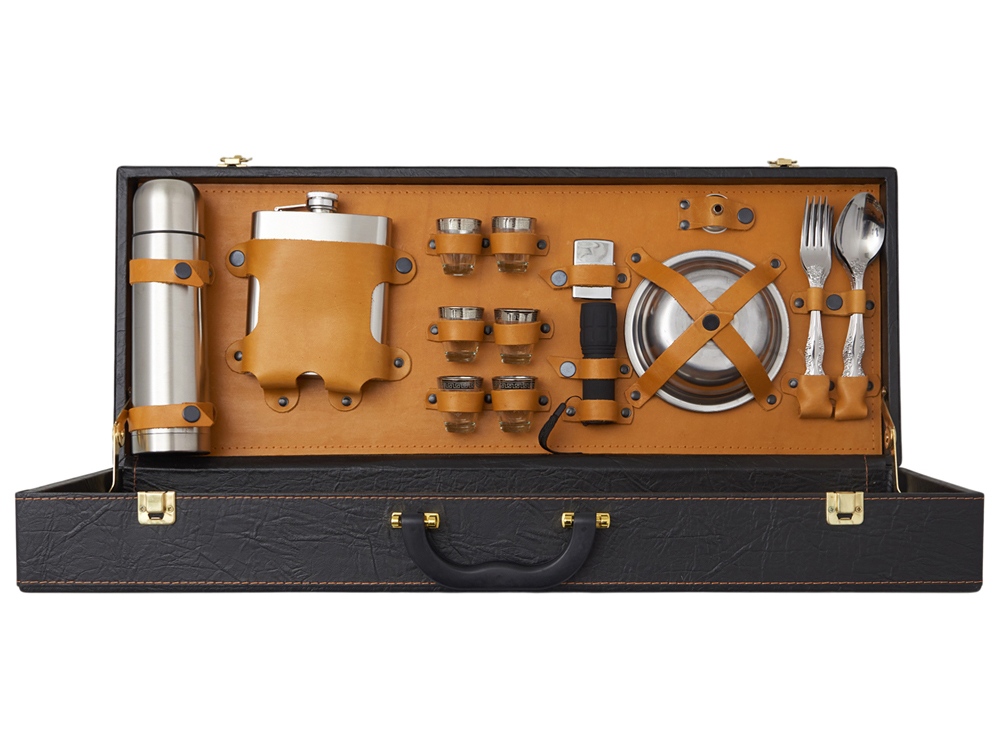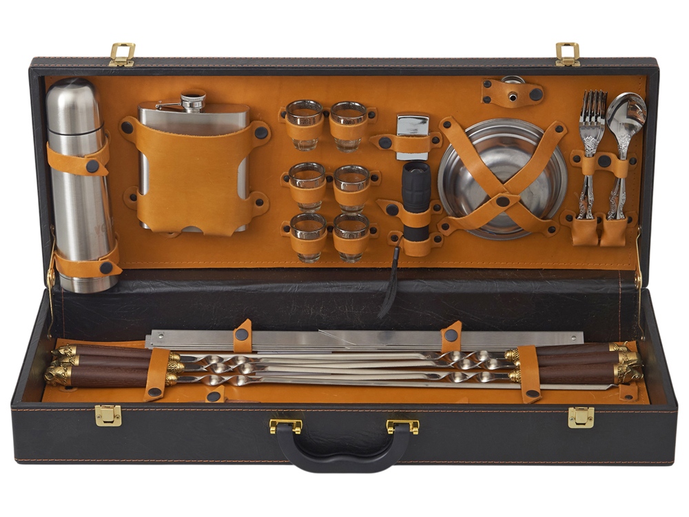 Комплектность: стопка- 6шт, термос, фляга, зажигалка, фонарь, тарелка-6шт, вилка-6шт, ложка-6шт, воронка, ножки для мангала-2шт, шампур-6шт, штопор, нож, нож Топорик