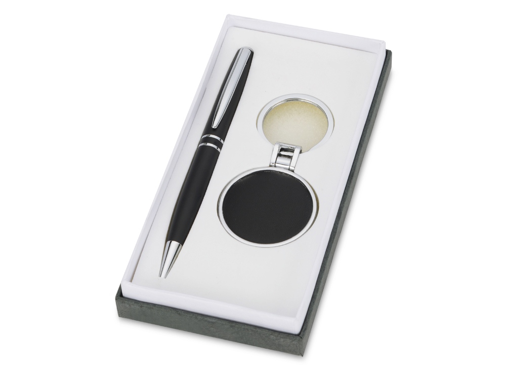 Набор обладает строгим, классическим сочетанием черного и серебристого цветов. Он отлично подчеркнет деловой стиль успешного руководителя. На брелок можно нанести логотип организации.