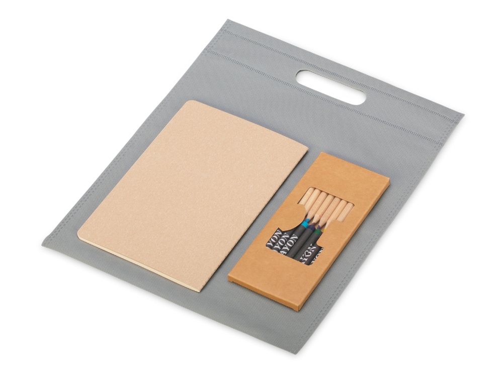 Комплектность: блокнот А5 14 х 21 х 0,3 см, набор карандашей 18,2 х 7,7 х 0,9 см, шоппер 28 х 35,5 см