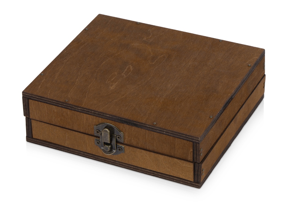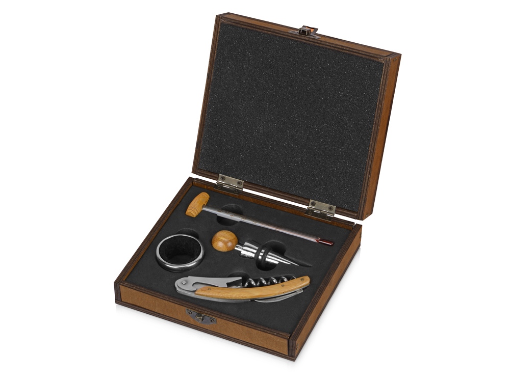 В набор аксессуаров для вина входят штопор-открывалка, воротничок на бутылку, пробка для бутылки и даже термометр. Набор поставляется в презентабельном деревянном футляре.