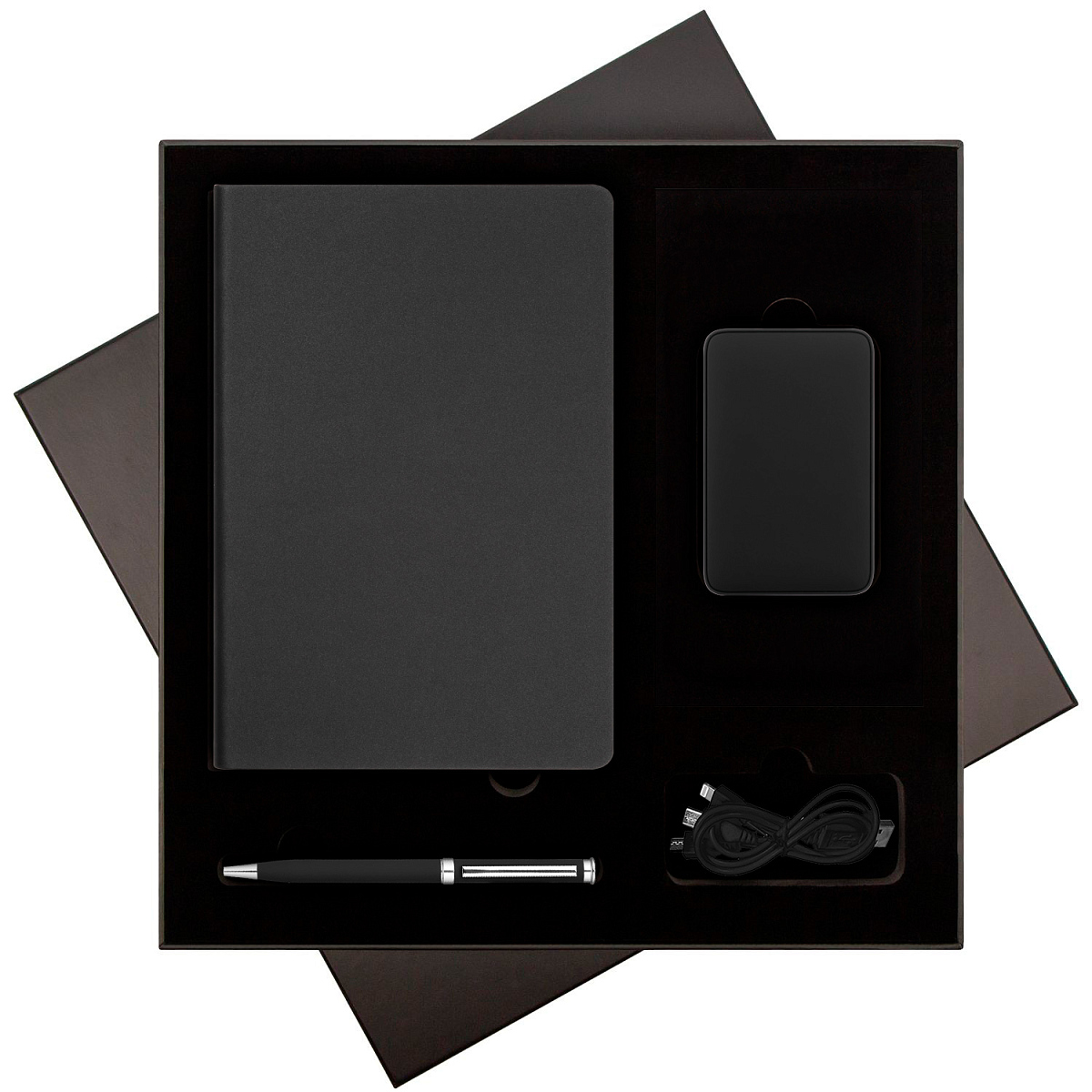 В комплекте: стильный ежедневник для планирования и любых записей, ручка для комфортного письма и внешний аккумулятор, который позволит оставаться на связи в любой ситуации.