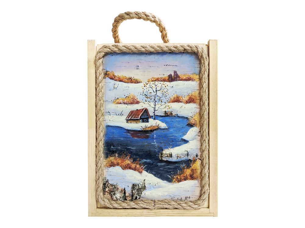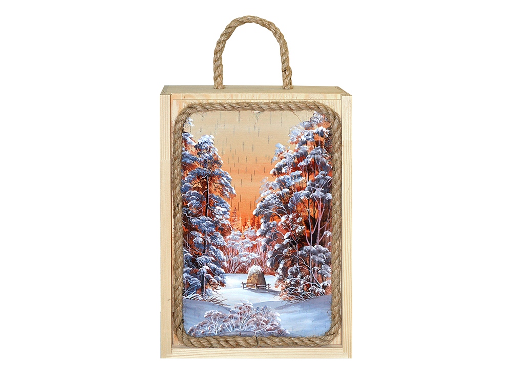 Подарочный короб исполнен из смолистой таёжной сосны. Крышка короба - это оригинальная картина, ручная роспись на бересте. На обратной стороне есть специальные отверстия, чтобы можно было повесить её на стену. Ни одна картина не повторяется, все абсолютно уникальны. На них изображены частицы живой природы - заснеженные таёжные деревушки, сибирские ели в снегу, реки в лунном свете - это настоящая живая Россия.