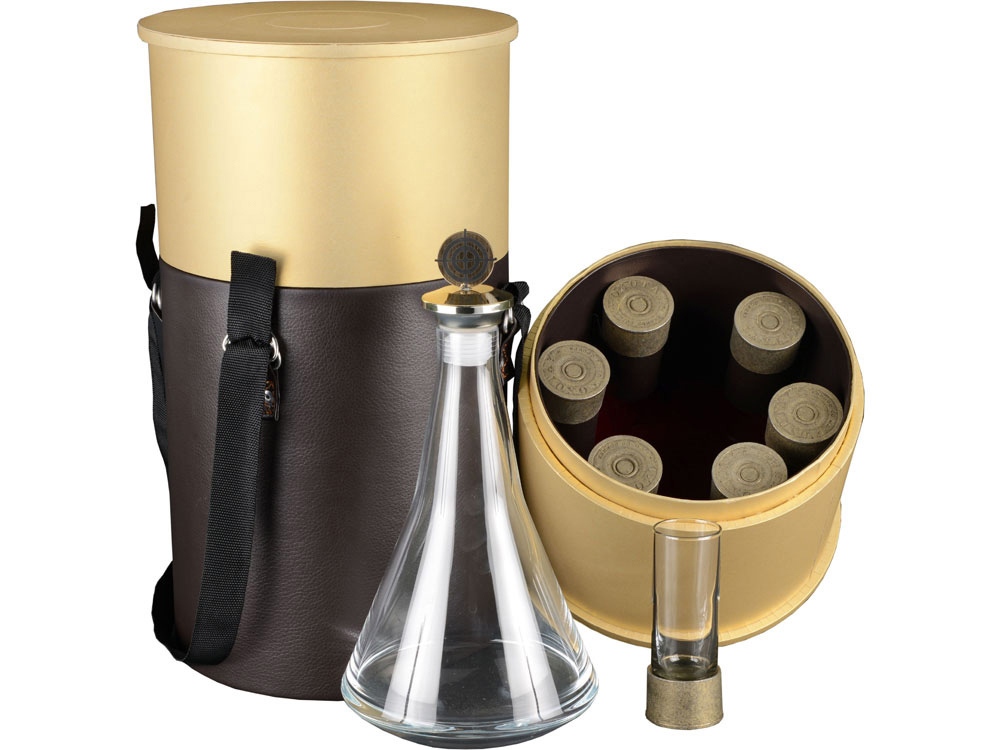 Необычная коробка в виде патрона, а в ней шесть стопок-патронов и графин 700 мл для водки с мишенью. Обычное застолье на охоте или после нее сразу становится очень романтичным.