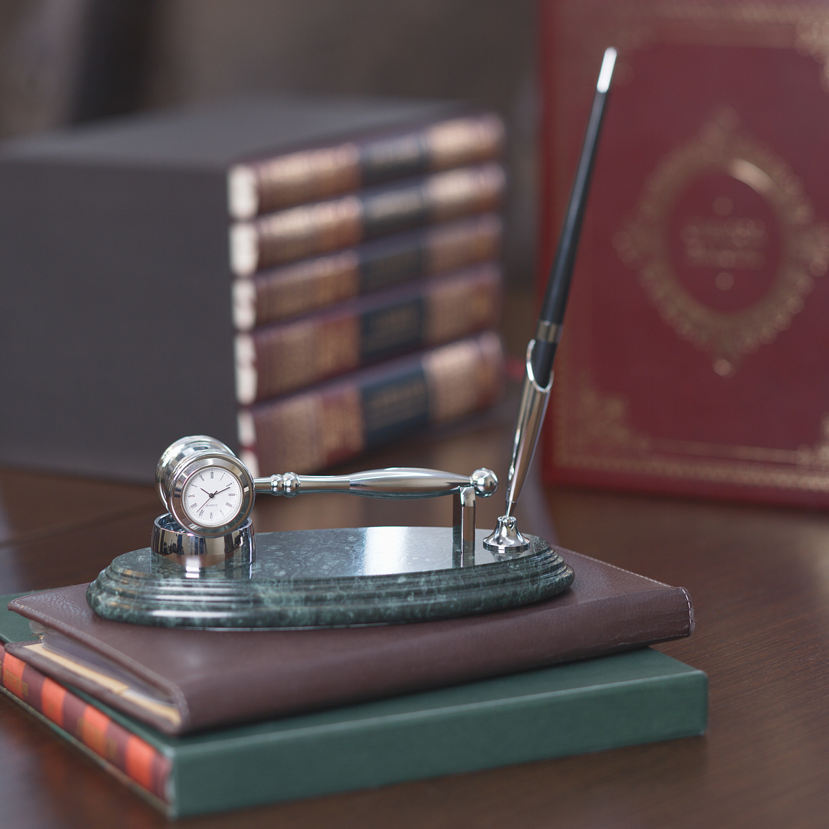 Набор «Правосудие» состоит из молотка председателя, в основании которого эффектно встроены часы, и шариковой ручки в черном лаковом корпусе. Прибор изящно впишется в обстановку рабочего кабинета, станет полезным настольным аксессуаром для работы. Подставка «Правосудие» с часами и ручкой — отличный выбор подарка начальнику, коллеге, другу или близкому человеку!