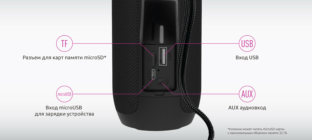 Интерфейсы: слот microSD, micro-USB, USB, Bluetooth, FM приемник, аудиовход, микрофон