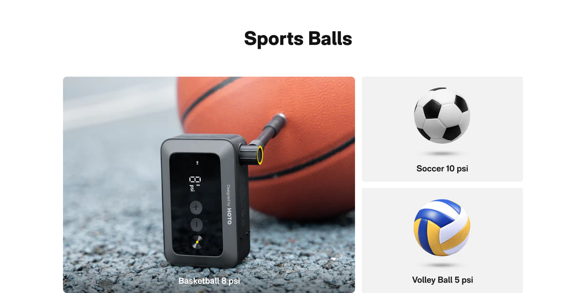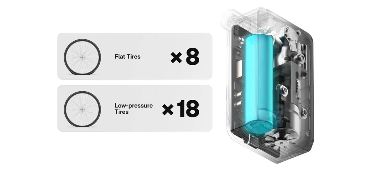 Особенности: встроенный литий-ионный аккумулятор емкостью 2000 мАч, способный надуть до 8 спущенных шин или добавить воздуха в 18 шин для шоссейных велосипедов; соединительный механизм поворачивается на 360; мощный двигатель обеспечивает быстрое накачивание шин