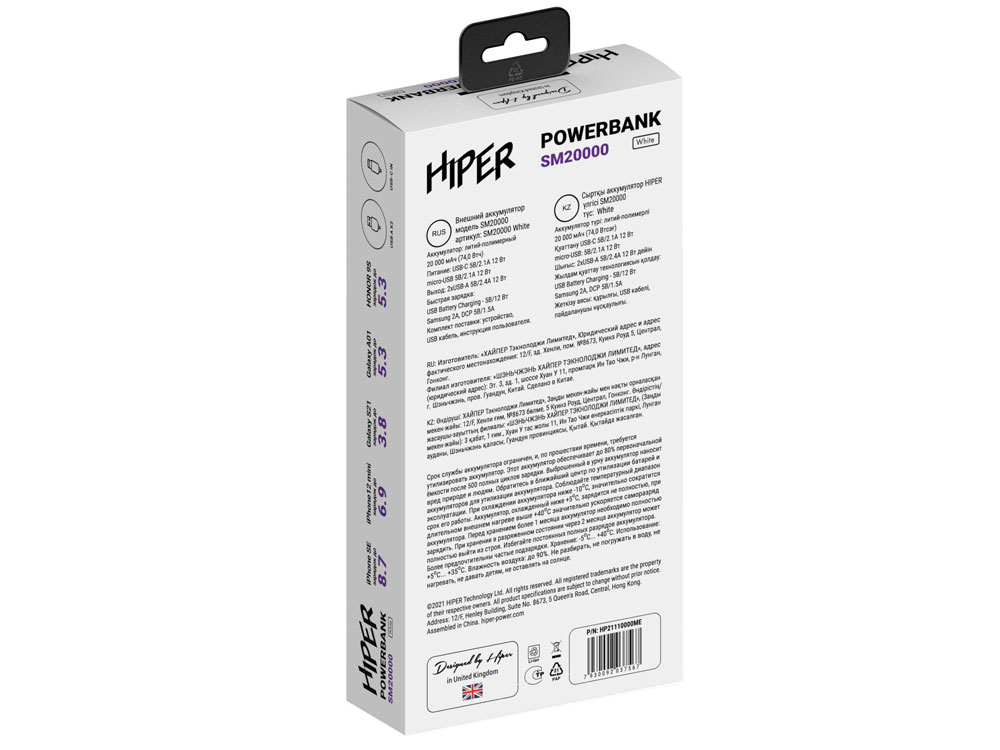 Портативный внешний аккумулятор HIPER SM20000 емкостью 20000 мАч (74Втч) оснащён входом USB-C для зарядки, Micro-USB входом для зарядки, 2xUSB-A выходами, максимальный выходной ток 2,1А, максимальная мощность 12 Вт.