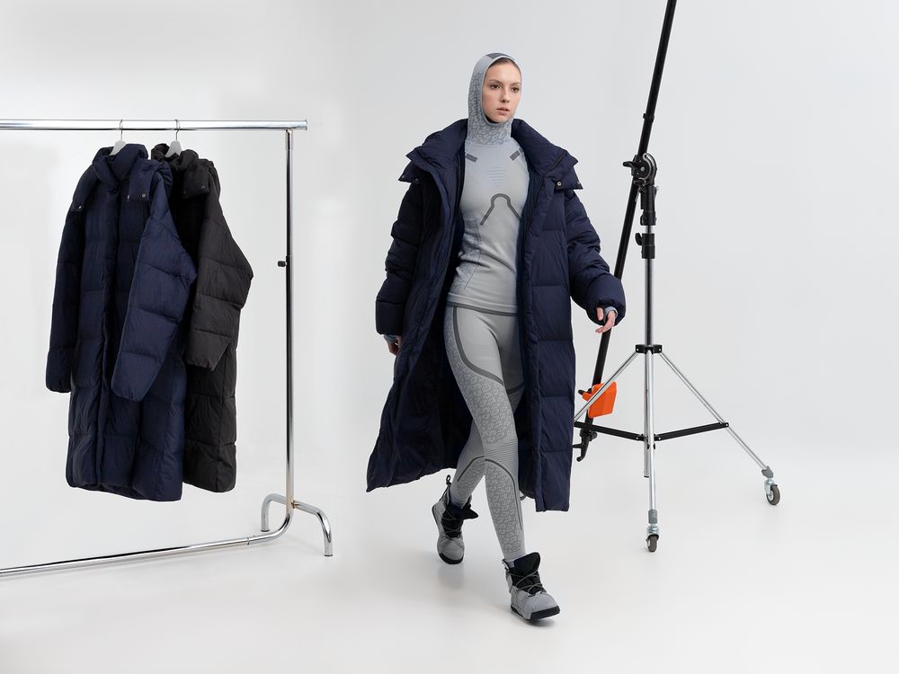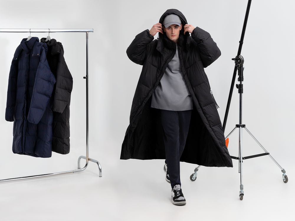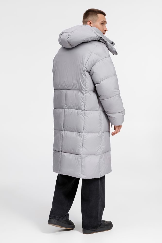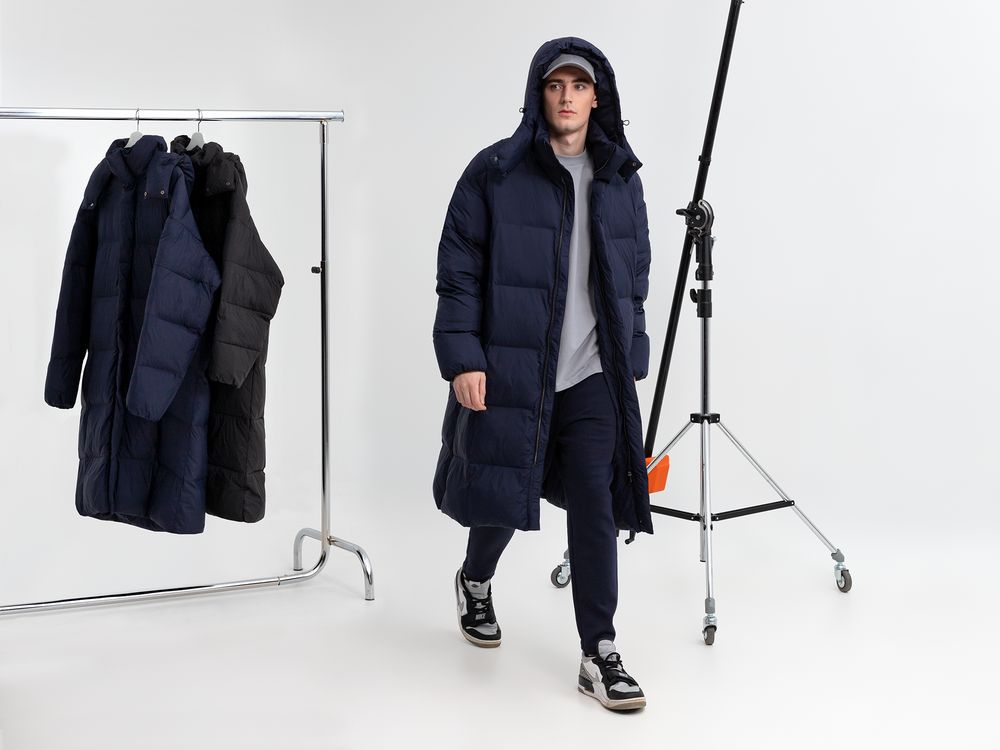 Удлиненный пуховик унисекс с капюшоном.