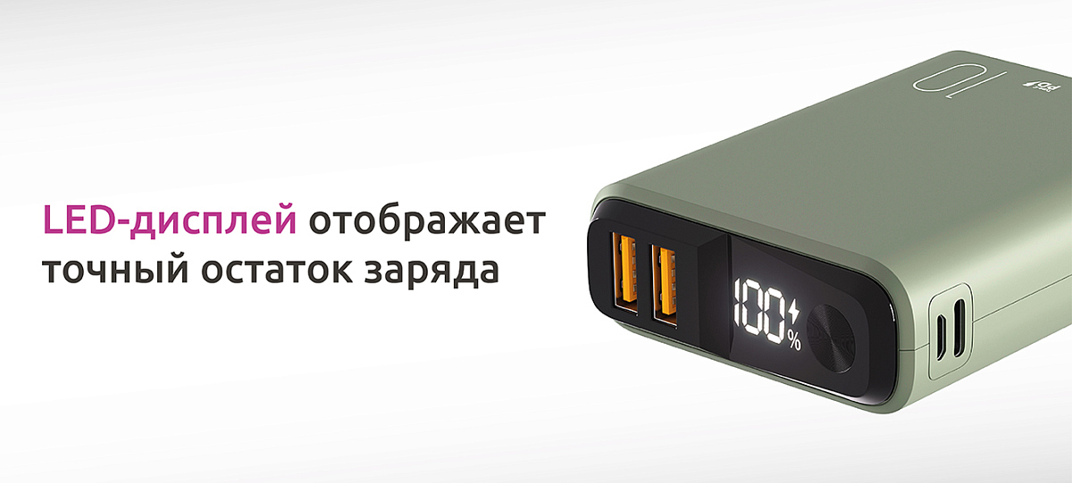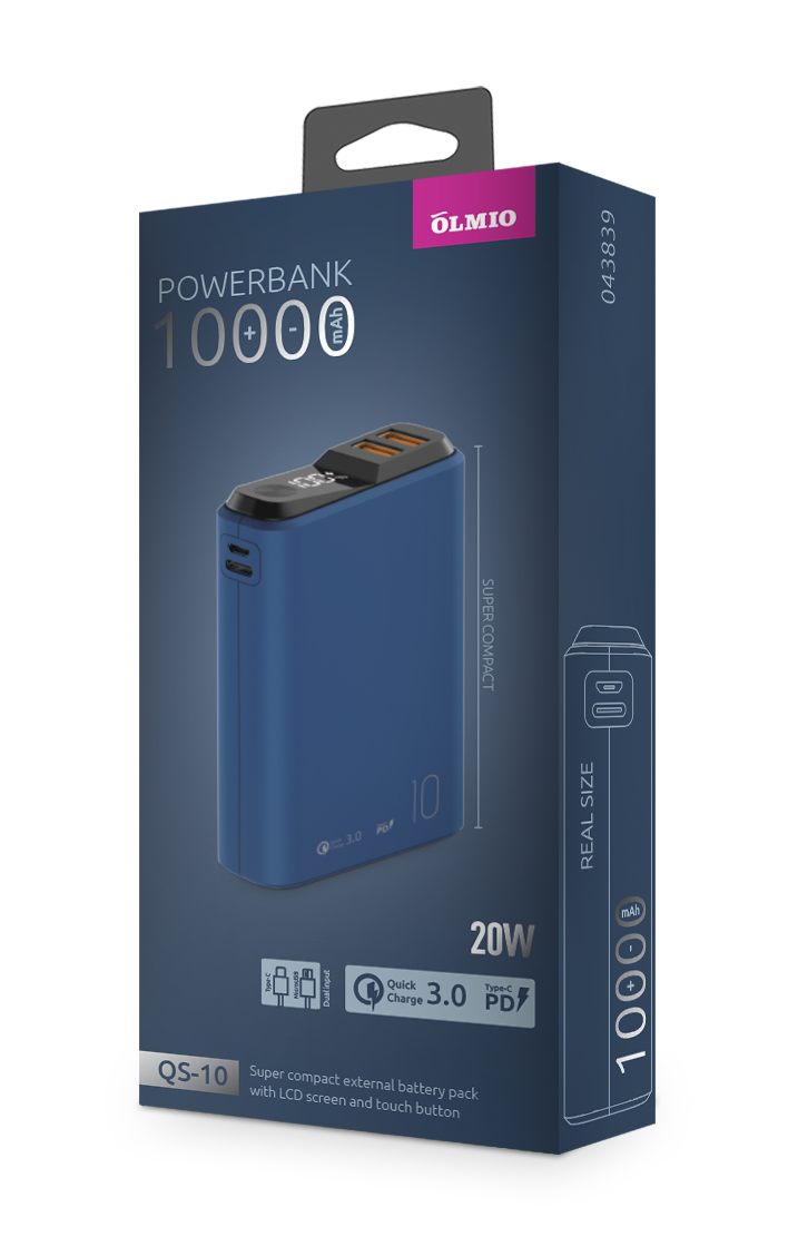 Особенности: LED дисплей с цифровым индикатором остатка заряда, Olmio QS-10 поддерживает быструю зарядку Quick Charge 3.0 на вход и выход, функция Power Delivery с помощью которой пауэрбанк QS-10 может передавать через разъем Type-C ток с максимальной выходной мощностью 18 Ватт, что соответствует требованиям мощных современных смартфонов и даже некоторых ноутбуков