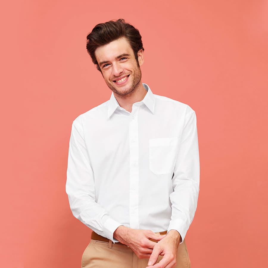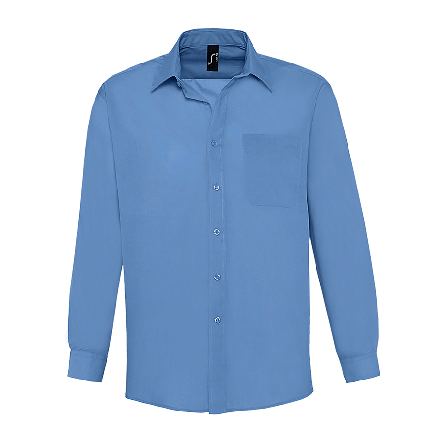 Мужская рубашка из смесового поплина с длинным рукавом.Смесовый поплин обеспечивает максимальный комфорт, лёгок в уход, не мнется.Стандартный крой (прямой).Длинный рукав.Жесткий воротник.Планка с 7 пуговицами в цвет изделия.Нагрудный карман слева.