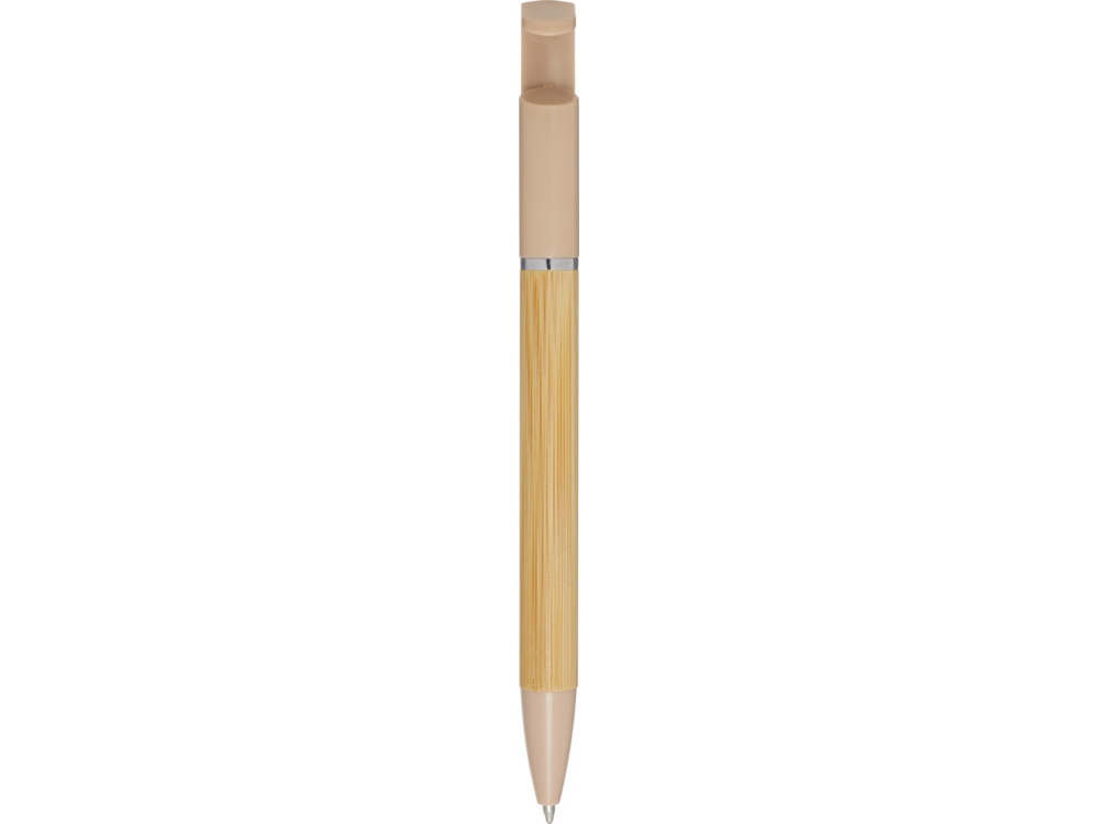 Бамбуковая шариковая ручка, которая также может служить подставкой для телефона. Кнопка и среднее кольцо изготовлены из переработанного пластика, наконечник — из латуни, а корпус — из бамбука, полученного из ответственных источников. Цвет чернил: синий. Длина непрерывной линии: 1000 метров. Размер пера: 1,0 мм. FSC certified bamboo. FSC Mix Credit N5 CU-COC-877277.