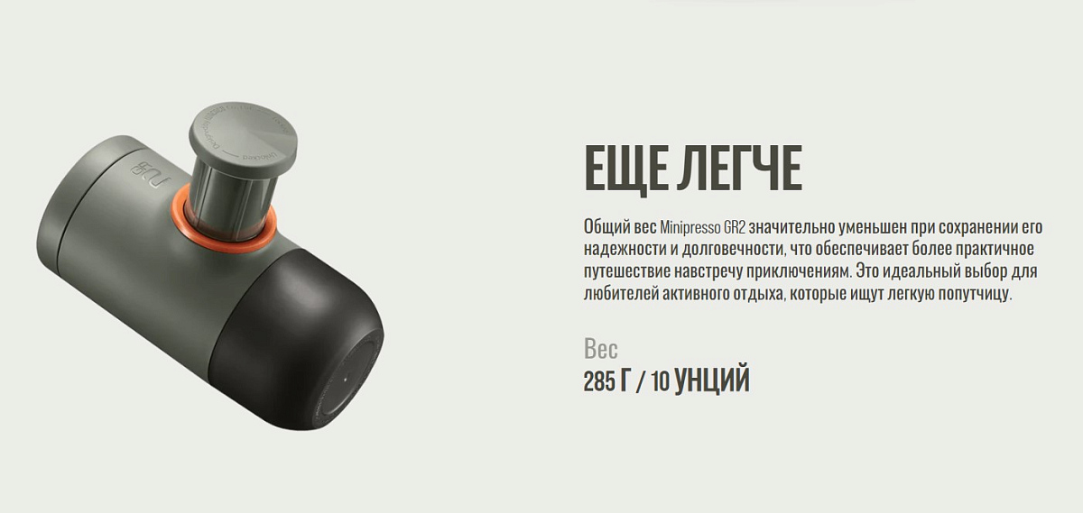 Особенности: Minipresso GR2 следующая эволюция Minipresso GR; благодаря меньшему размеру и весу он по-прежнему обеспечивает исключительное качество эспрессо в чашке; мы значительно улучшили знаменитый Minipresso в двух важнейших областях: экологичность и удобство использования; почувствуйте максимальную свободу в приготовлении кофе благодаря нашему инновационному новому дизайну со встроенной регулируемой корзиной