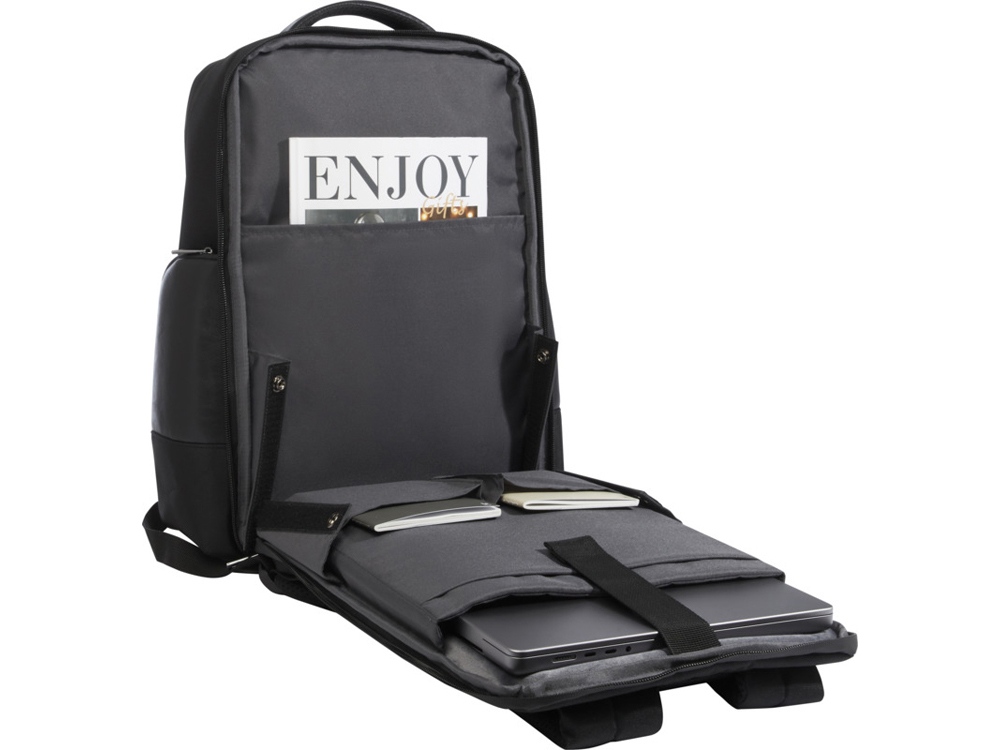 Изящный, большой и прочный рюкзак для ноутбука Expedition Pro, сертифицированный по стандарту GRS, станет идеальным спутником для профессионалов, которые всегда в пути. Он изготовлен из водоотталкивающего переработанного PET-пластика 900D в сочетании с элементами из полиуретана премиум-класса и подкладкой из переработанного PET-пластика. Он имеет специальное отделение для ноутбука с диагональю 15,6 дюйма, отделение для планшета, просторное основное отделение со вшитым герметичным карманом для туалетных принадлежностей, несколько карманов-органайзеров и боковых карманов, передний карман на молнии и потайной карман прямо под багажным ремнем на спине. Модель имеет мягкие регулируемые лямки, встроенный карман для карточек, петлю для солнцезащитных очков, формованную подкладку из воздушной сетки, а также мягкую ручку, обеспечивающую максимальный комфорт и удобство при переноске. Объем: 25 литр. Не содержит ПВХ. 900DGRS certified recycled polyester.