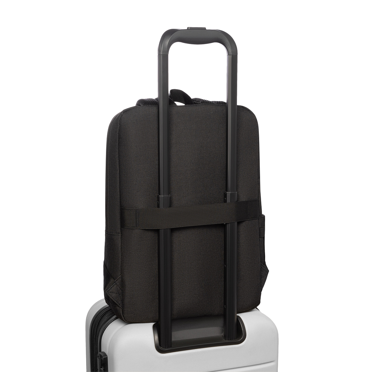 С одной стороны рюкзака также располагается внешний карман – для зонта или бутылки с водой. На спинке лента для фиксации на ручке дорожного чемодана.