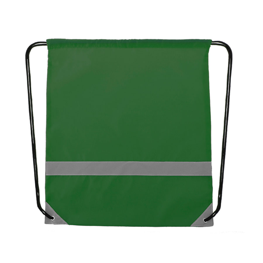Рюкзак из мягкого полиэстера 190T со светоотражающей полосой спереди. Самозакрывающиеся черные завязки и светоотражающие уголки, усиленные металлическими кольцами.