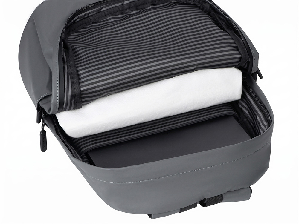 Элегантный легкий городской рюкзак из мягкого приятного на ощупь материала можно использовать для передвижений по городу, а так же в поездках, для чего на спинке предусмотрен ремень для крепления на ручку чемодана. Для удобства и компактного хранения содержимого снаружи расположены 2 передних кармана на молниях и 2 боковых кармана. Внутри уплотненный карман для ноутбука. Стильная подкладка в полоску в тон цвета внешнего материала делает рюкзак модным аксессуаром. Благодаря водостойкому материалу и молниям содержимое рюкзака не намокнет под дождем. Лямки регулируются по длине.