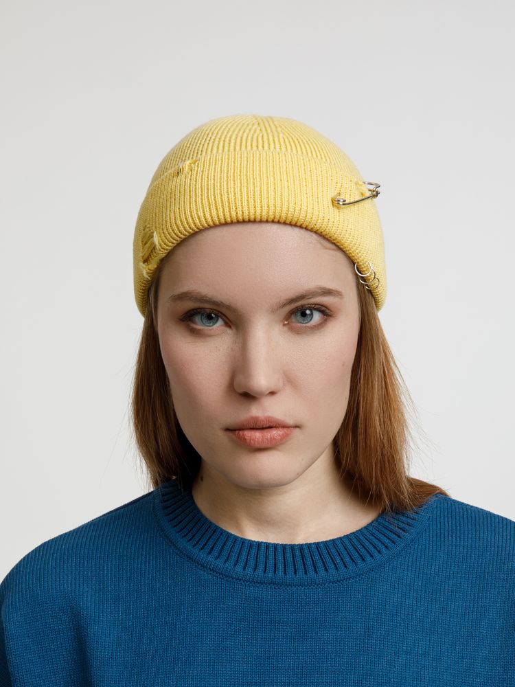 Однослойная шапка бини с рваным отворотом и металлическими аксессуарами для дерзких образов в любом возрасте. Яркий и запоминающийся акцент в стиле гранж.