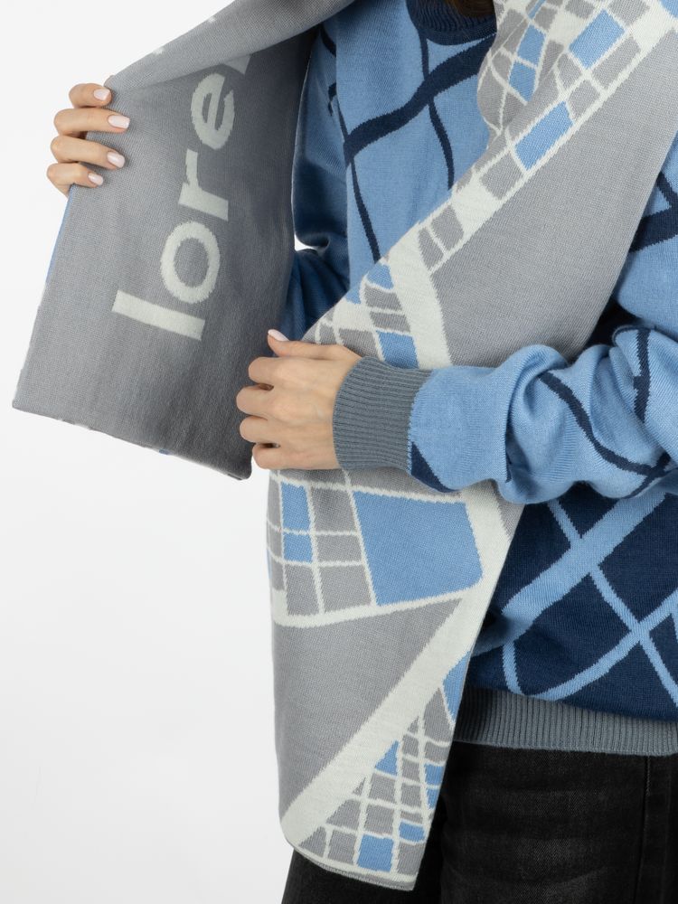 Шарф с вывязанным логотипом и индивидуальным рисунком в фирменной цветовой гамме.
