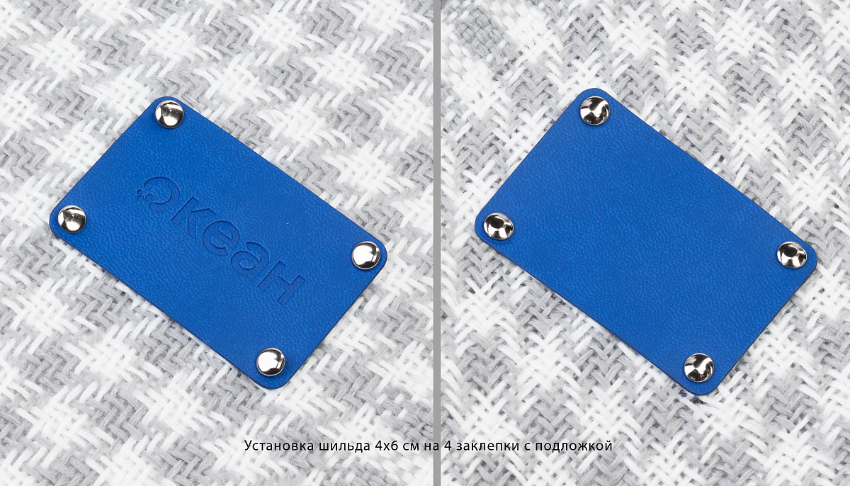 Шильд 4 х 6 см для кастомизации пледов и других изделий. Матовый материал с имитацией фактуры замши. Установка производится на металлические хольнитены (заклепки) по углам.