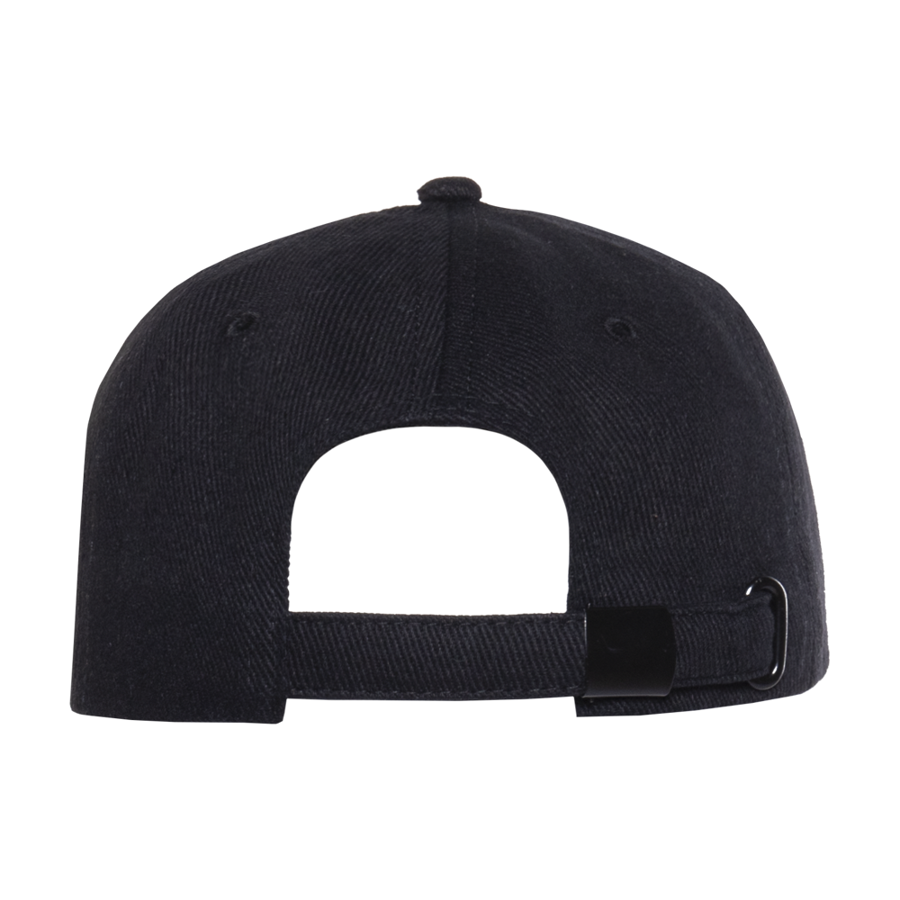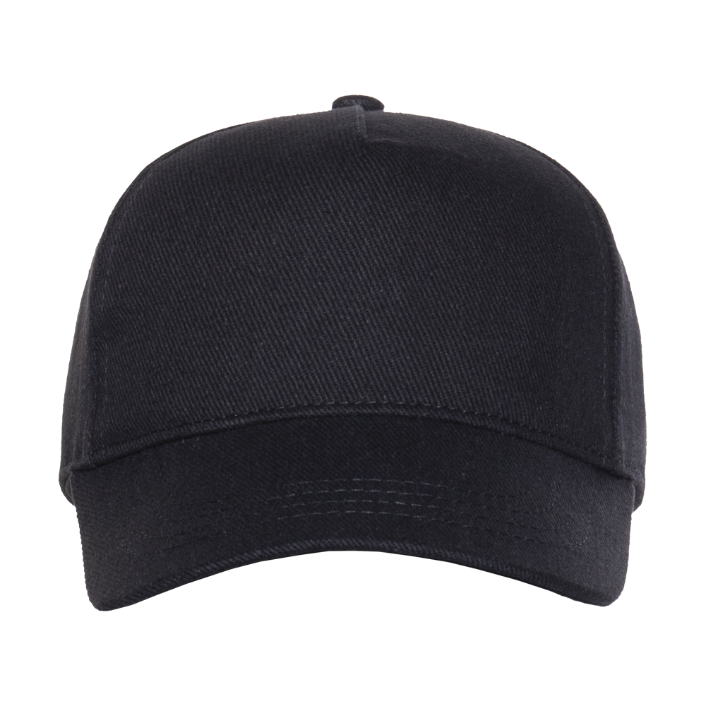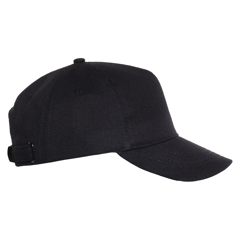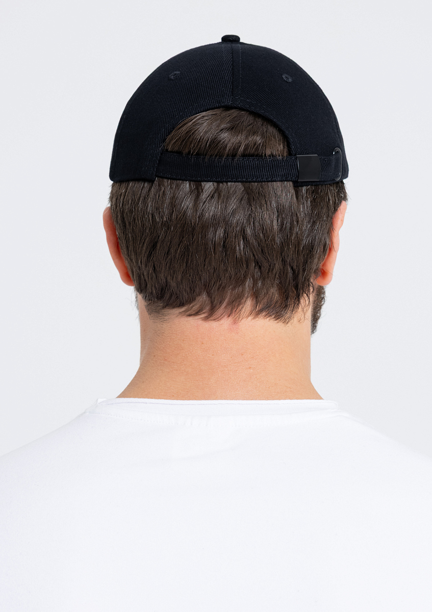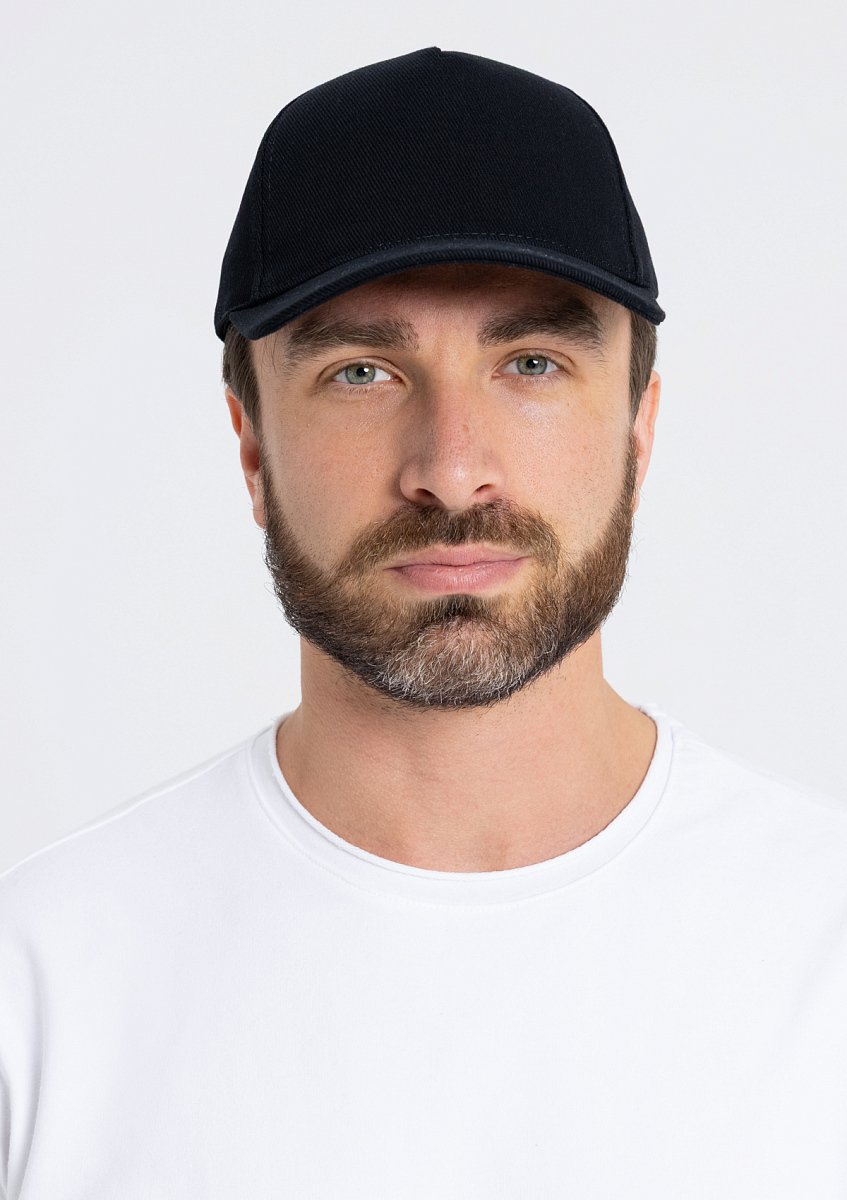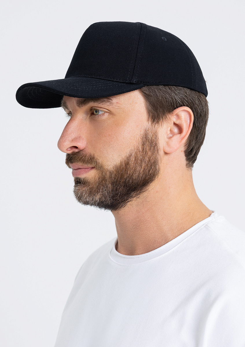 Бейсболка-пятиклинка без лобового шва с изогнутым жестким козырьком и регулируемой металлической застежкой.